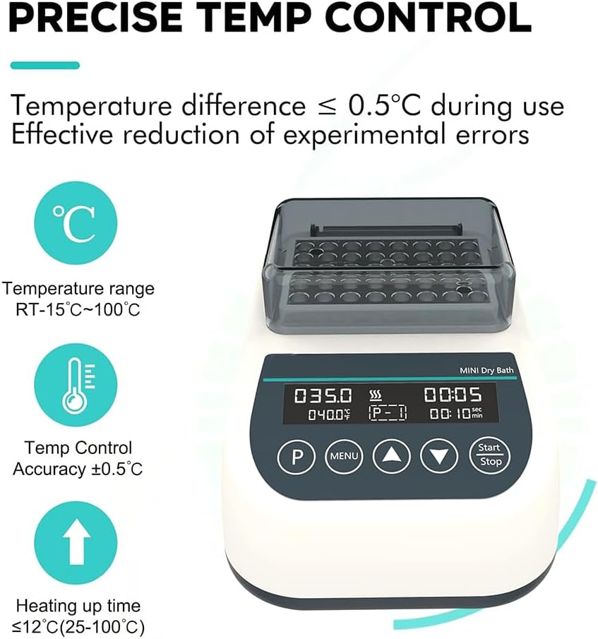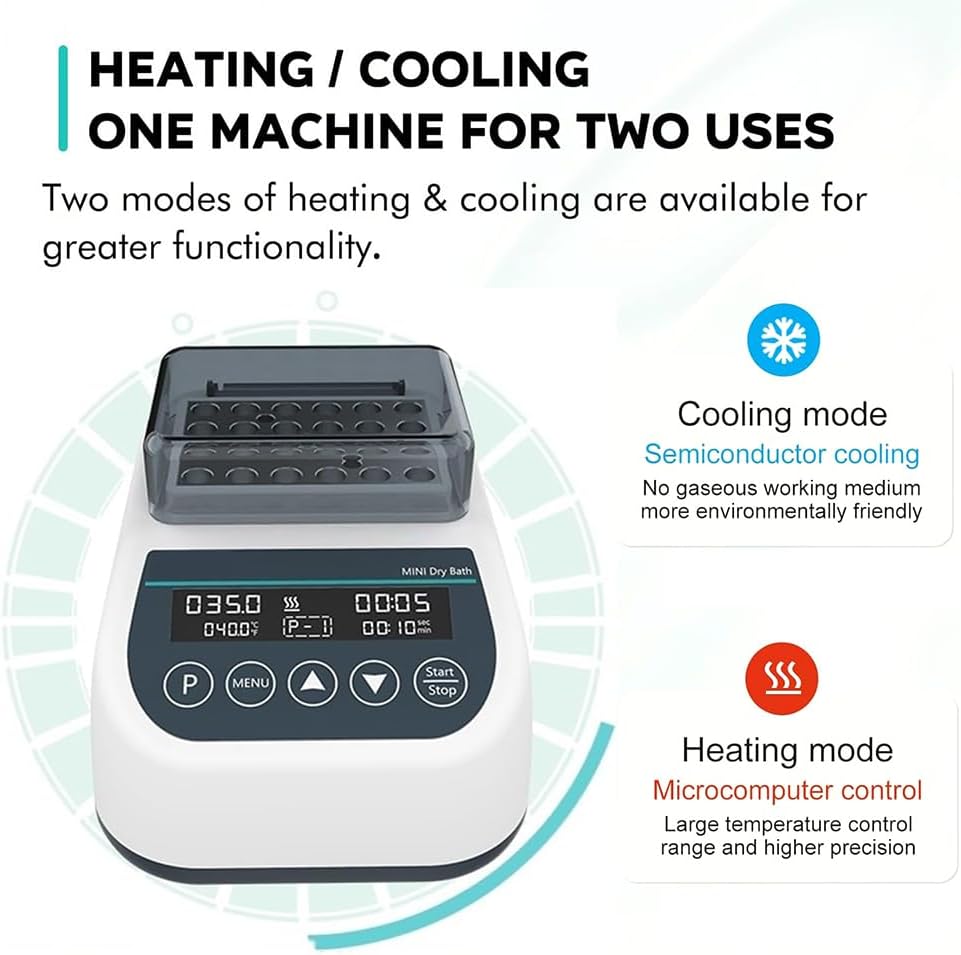 【Heating and cooling】: The dry bath incubator has two modes: heating and cooling, and has a temperature deviation calibration function. The temperature control accuracy is ±0.5°C, and the display accuracy is ±0.1°C.
