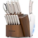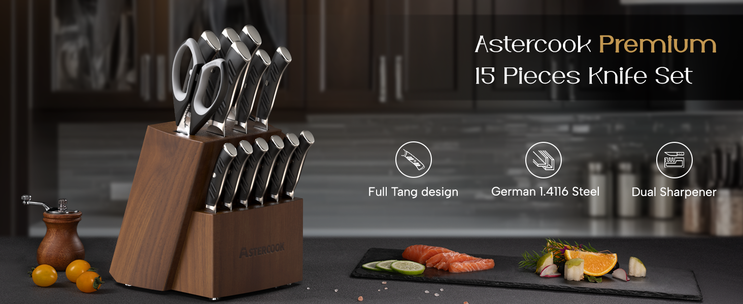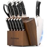 مجموعة سكاكين أستيركوك، مجموعة سكاكين المطبخ مع كتلة ومبراة مزدوجة كاملة تانغ 15 قطعة من سكاكين الفولاذ المقاوم للصدأ الألمانية ذات الشفرة الحادة الآمنة للاستخدام في غسالة الأطباق مع مقبض مريح، أسود أنيق in Kuwait