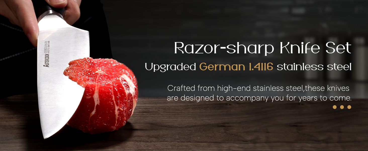 • 【فولاذ ألماني فاخر 1.4116 عالي الكربون من الفولاذ المقاوم للصدأ】: مصنوعة من الفولاذ الألماني 1.4116 عالي الجودة، تتميز مجموعة السكاكين هذه بشفرة حادة بشكل لا يصدق، مما يجعلها تتشقق من خلال الطعام مثل الزبدة.