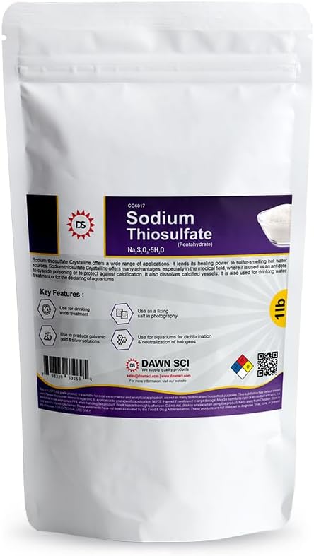 This 1 lb package of Sodium Thiosulfate (Pentahydrate) is a high-quality chemical compound commonly used as a dechlorinating agent and reducing agent in laboratory, industrial, and technical applications. It is effective in neutralizing chlorine , making it suitable for water treatment processes, laboratory testing, and chemical preparation. Sodium thiosulfate pentahydrate is also widely used in photography processing, analytical chemistry, and educational laboratory settings where consistent and reliable reagent performance is required. Its crystalline form dissolves readily in water, allowing for easy handling and accurate dosing. Packaged in a secure container to help maintain product quality during storage, this sodium thiosulfate is intended for professional, laboratory, and industrial use only and is not suitable for food, drug, or household applications. 100% Pure Crystal Form ✔️ Technical-Grade Dechlorinator ✔️ Ideal For Agriculture & Aquaculture ✔️ Perfect For Aquarium Enthusiasts & Fish Keepers