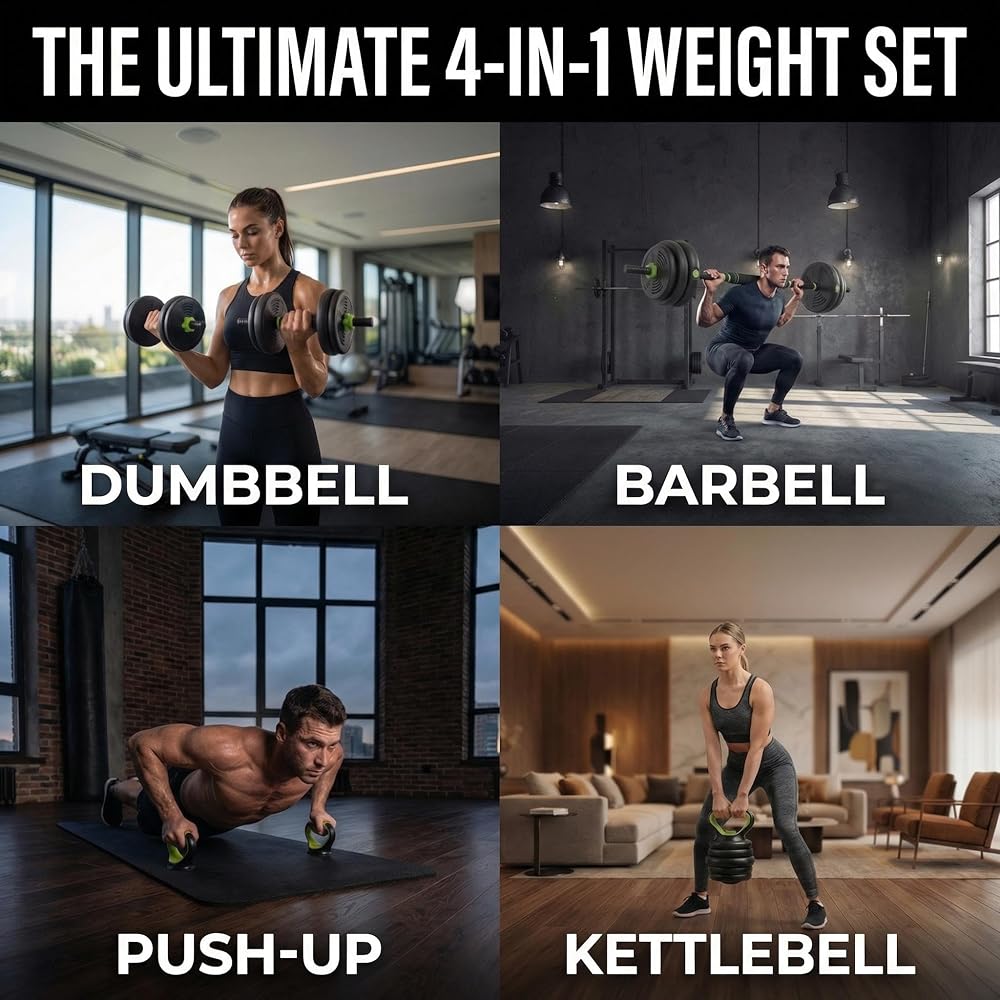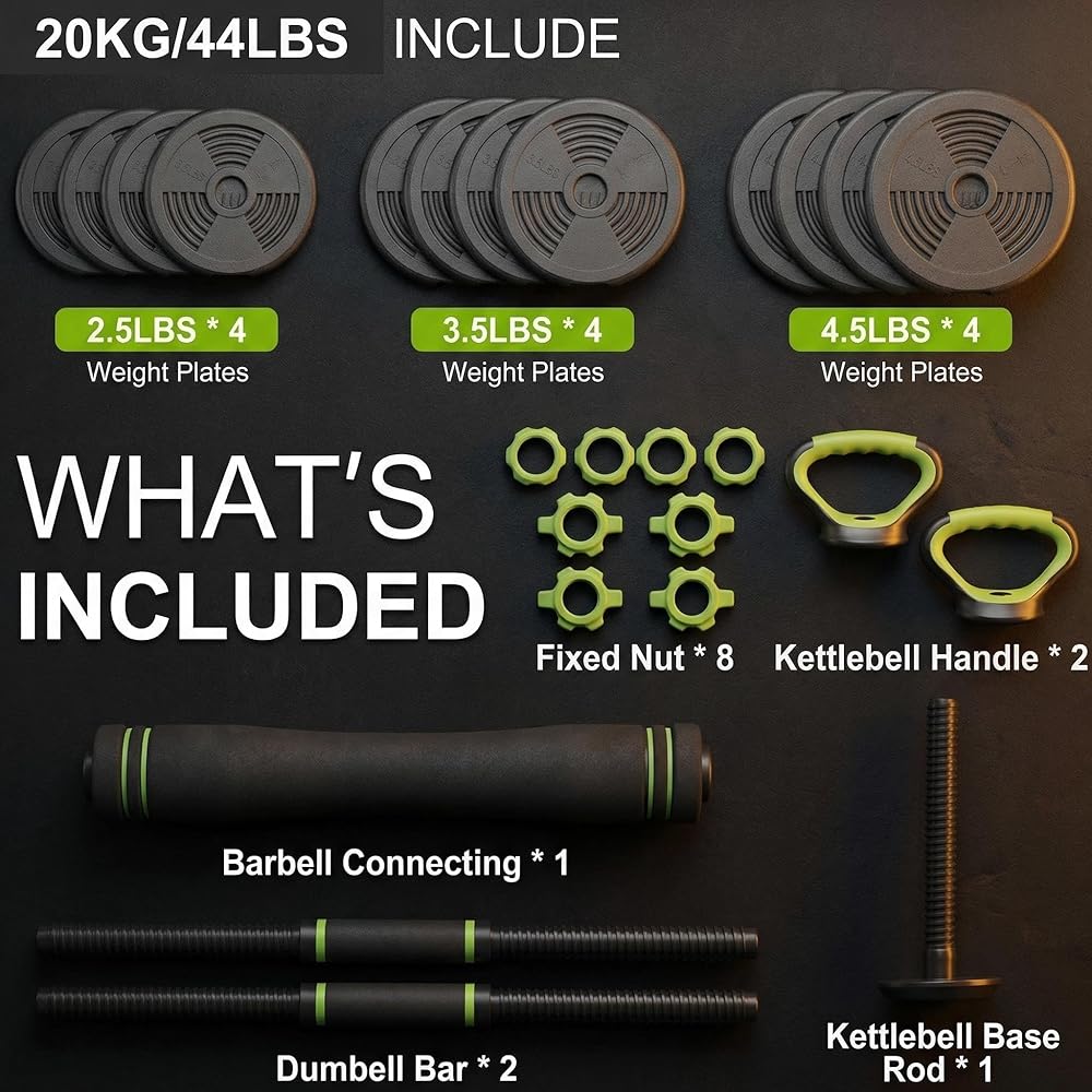 مجموعة دمبل قابلة للتعديل بوزن 44 رطل، مجموعة أوزان مجانية 4 في 1 مع أثقال وأثقال كيتل بيل ومقابض دفع لأعلى، صالة ألعاب رياضية منزلية مدمجة الكل في واحد للرجال والنساء، قبضة مضادة للانزلاق، ألواح هادئة مطلية بالمطاط
