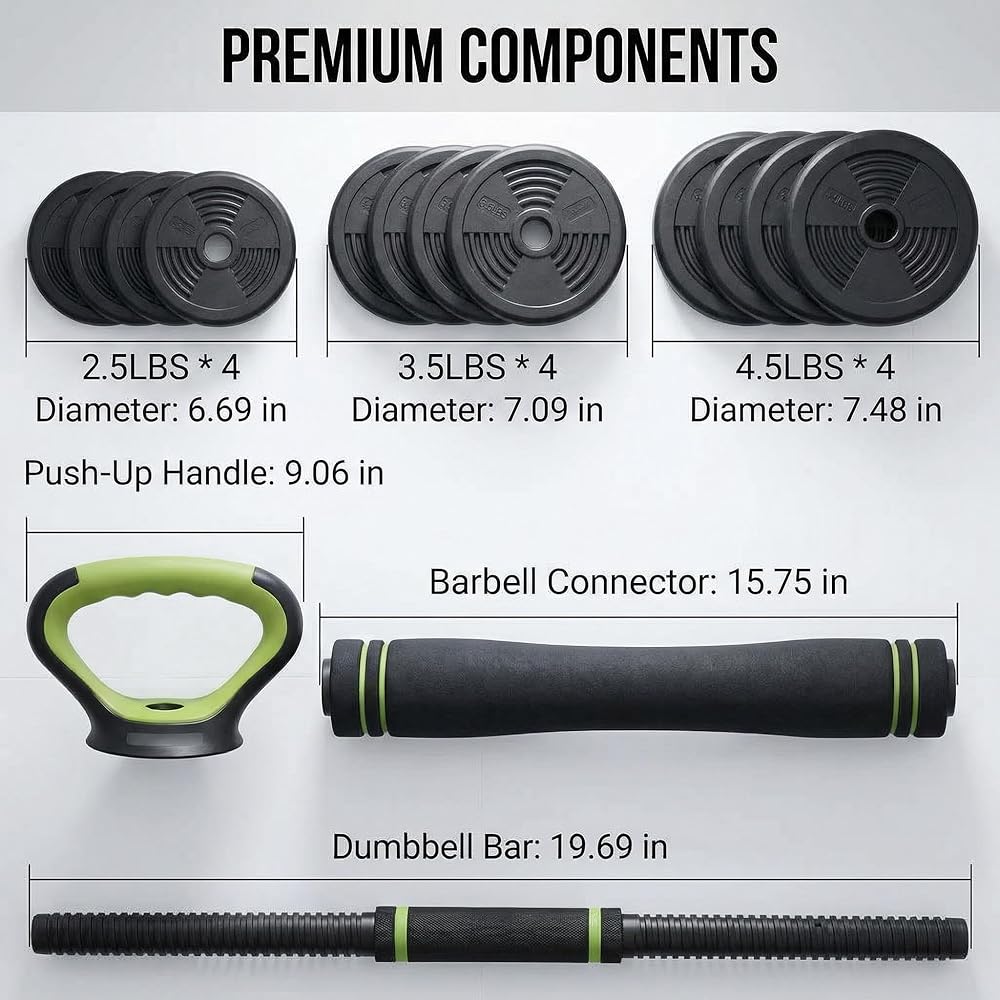 [نظام تدريب متعدد الاستخدامات 4 في 1] تتحول مجموعة الدمبل القابلة للتعديل هذه بسهولة إلى دمبل، وحلاق، وأجراس كيتل، وحوامل رفع في مجموعة وزن واحدة مدمجة. مصمم لتدريبات القوة لكامل الجسم، وهو يدعم تدريبات الأوزان الحرة للذراعين والصدر والظهر والساقين والعضلات الأساسية - وهو مثالي لمستخدمي صالة الألعاب الرياضية المنزلية الذين يريدون أقصى قدر من التنوع مع الحد الأدنى من المعدات.
