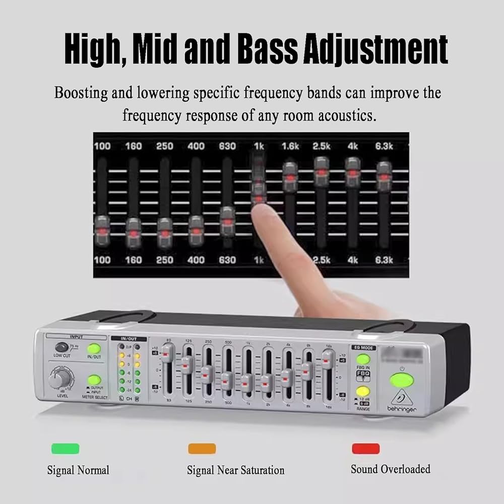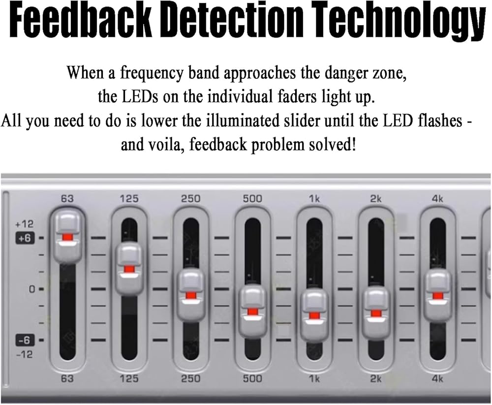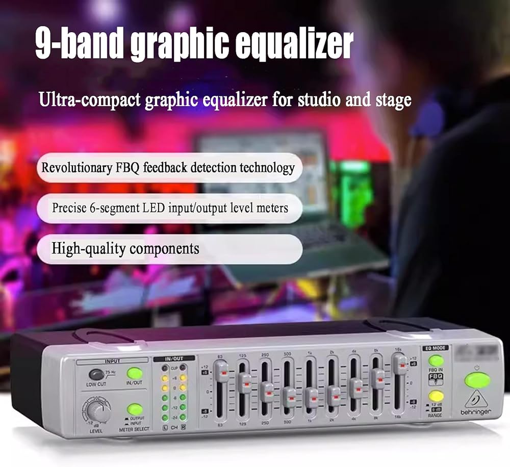 【9-band graphic equalizer】: With its nine frequency bands, you can easily fine-tune the sound and eliminate feedback instantly. Each fader can be used to increase or decrease the frequency range it controls by up to 12DB, an ultra-compact graphic equalizer for studio and stage.