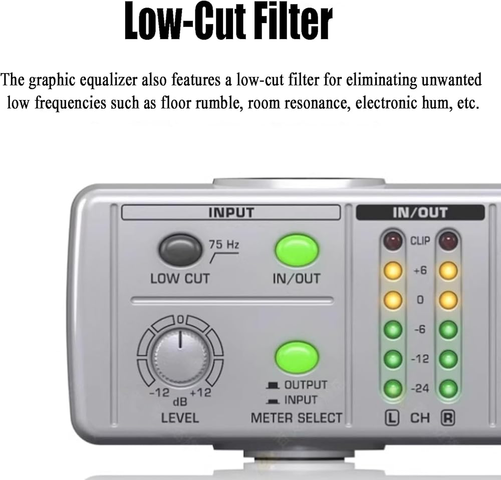 【Low-cut filter】: The graphic equalizer also has a low-cut filter for eliminating unwanted low frequencies such as floor rumble, room resonance, electronic hum, etc.