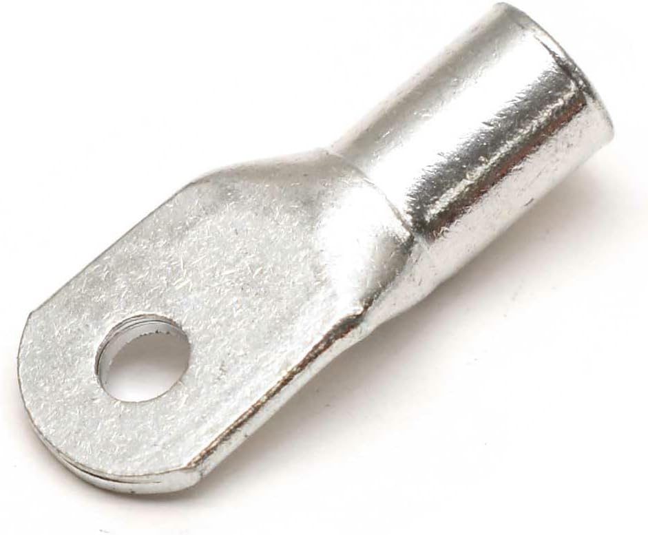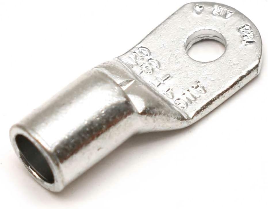 Each terminal lug measures approximately 1/2" W x 1 3/8" L overall and feature a 3/16" stud size. Per the manufacturer, these lugs fit with 4 AWG sized wire and are not insulated.