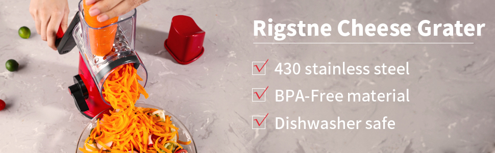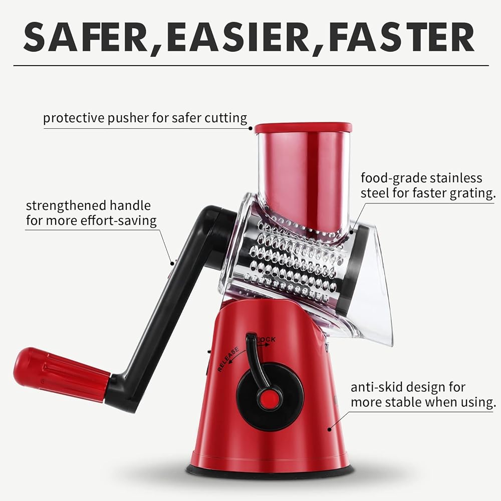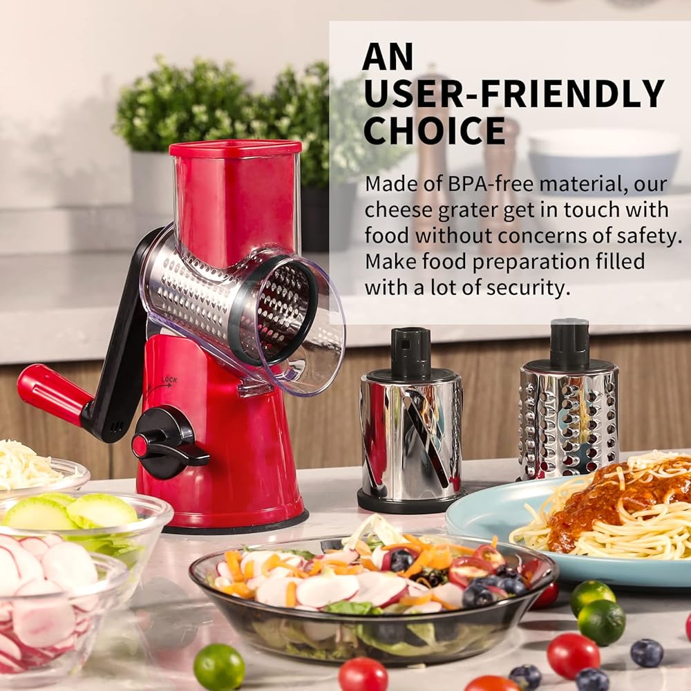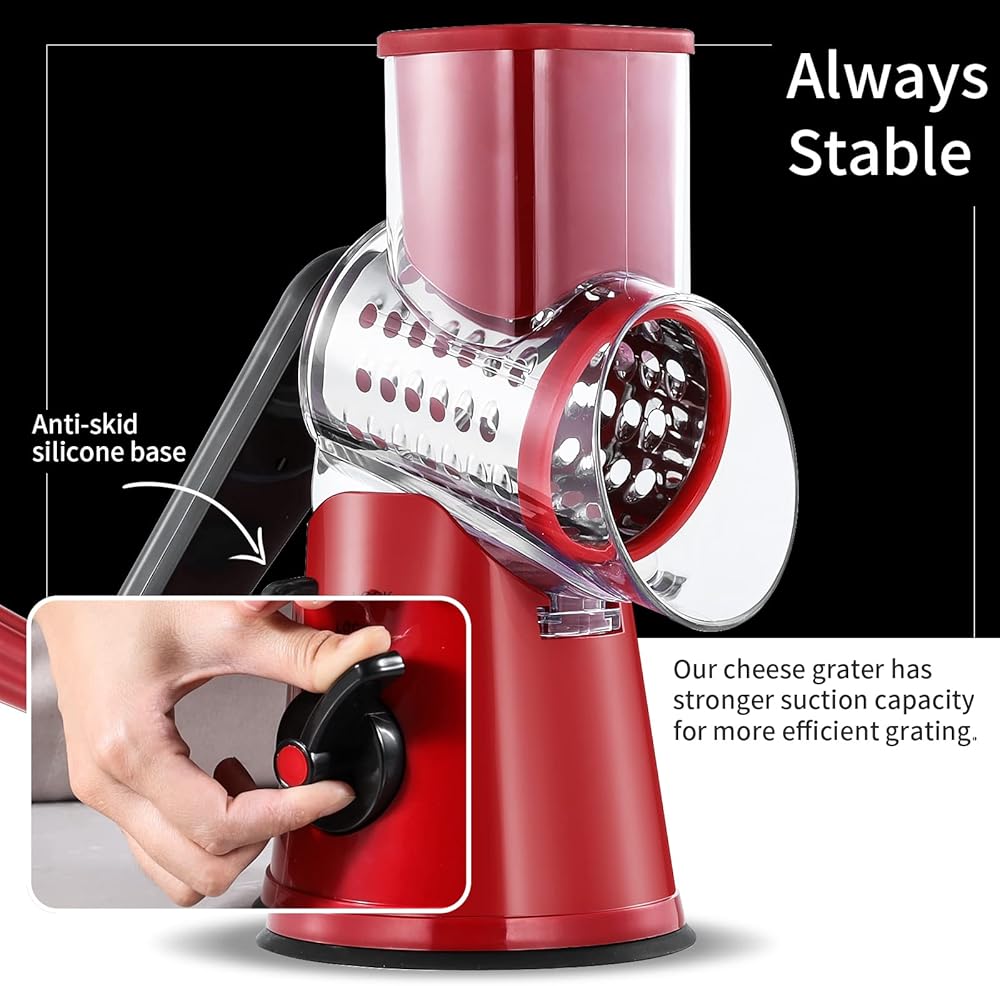 ضمان سلامتك: مع قاعدة السيليكون المضادة للانزلاق في الأسفل، تتمتع مبشرة الجبن الخاصة بنا بقدرة شفط قوية من أجل بشر أكثر كفاءة. التصميم الواقي للمبشرة الدوارة يمنعك من لمس الشفرة عند القطع، مما يجعلها آمنة للاستخدام