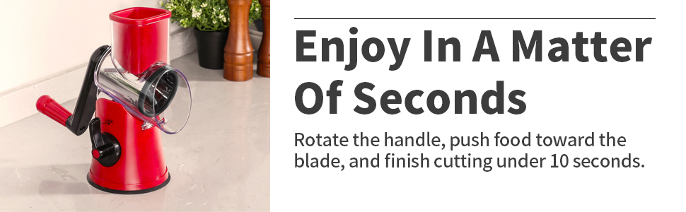 بشر سريع: قم بإنهاء التقطيع/التقطيع/البشر في غضون 10 ثوانٍ عن طريق إدارة المقبض، وتساعد مبشرة الجبن الدوارة هذه على تقليل وقت التحضير وتجعلك تستمتع بالطهي. ستوفر لك مبشرة المطبخ هذه الكثير من الوقت في تحضير الطعام