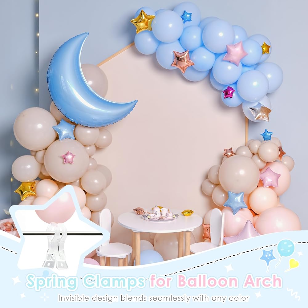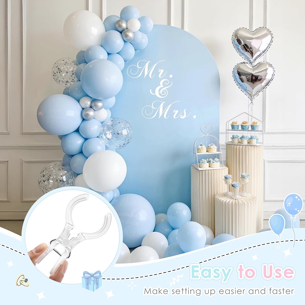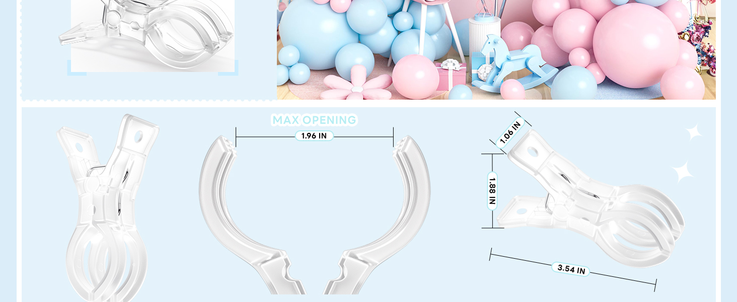 تصميم غير مرئي: مظهر شفاف يجعل المشابك البلاستيكية غير مرئية بصريًا، ويمتزج بسلاسة مع أي أقواس بالونات أو خلفيات؛ يساعد في الحفاظ على إعداد نظيف ومتماسك