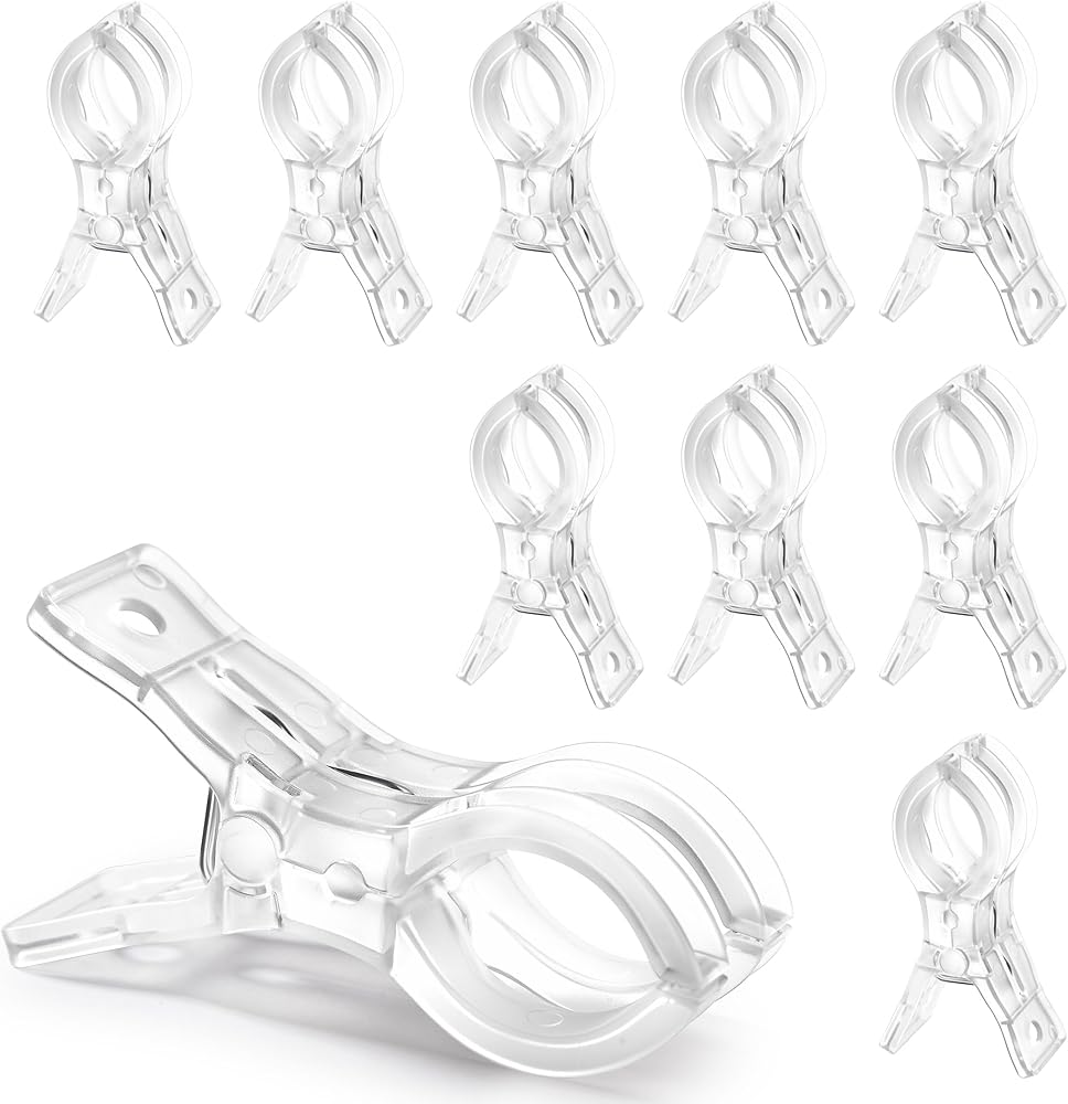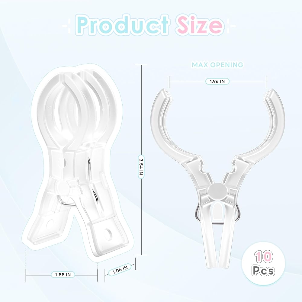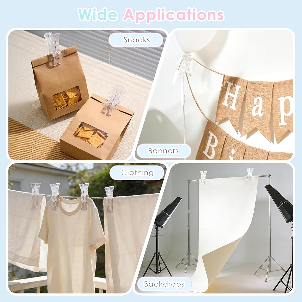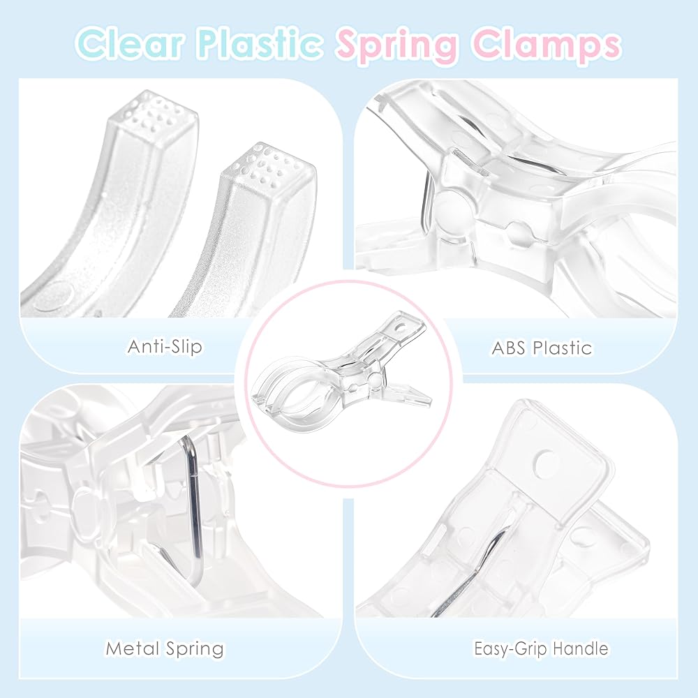 سهلة الاستخدام: تتميز المشابك الزنبركية الشفافة برأس على شكل قوس وتصميم مريح مزدوج المشبك، سهلة الفتح والإغلاق؛ مع فتحة بحد أقصى 1.96 بوصة، مما يسمح بإعداد سريع وفعال