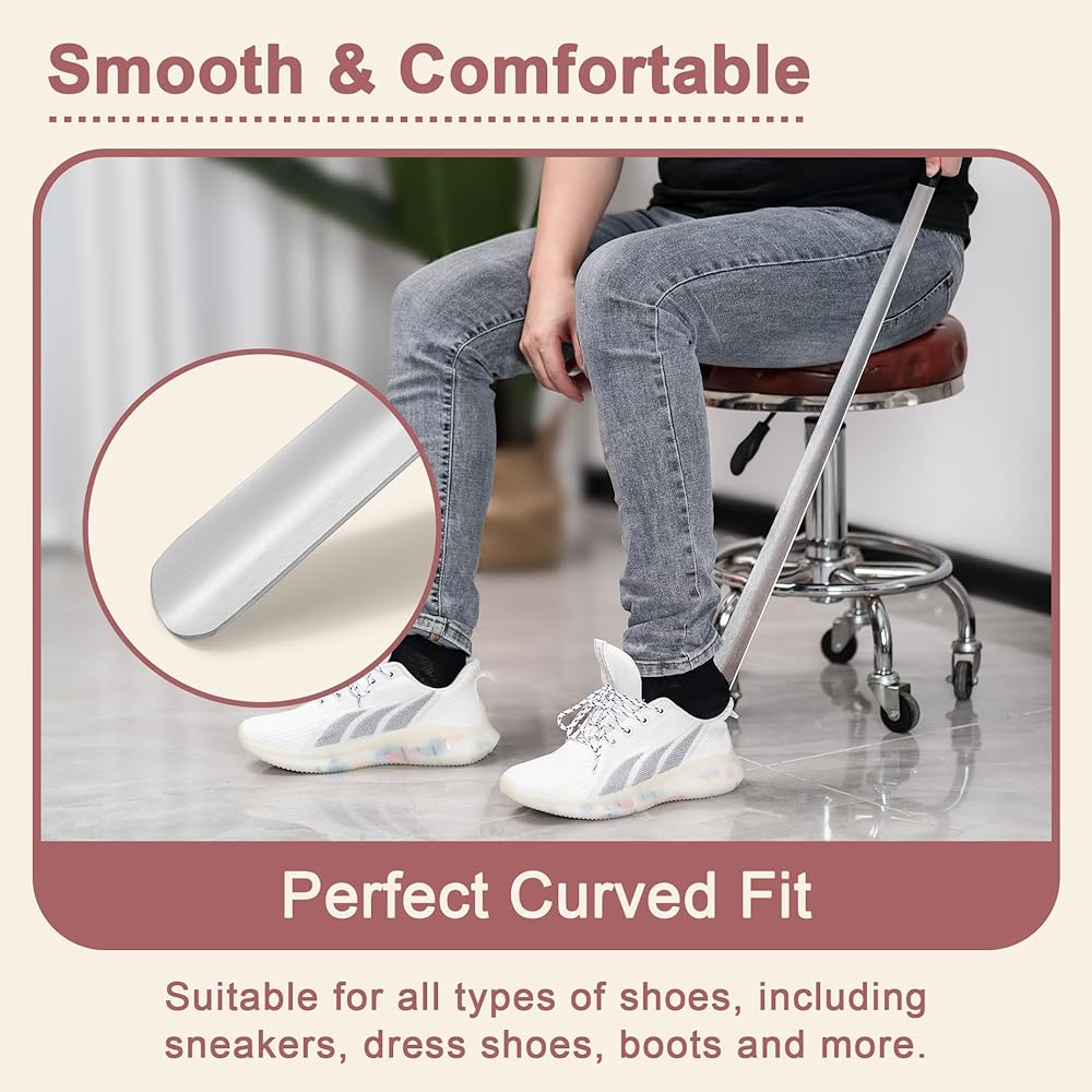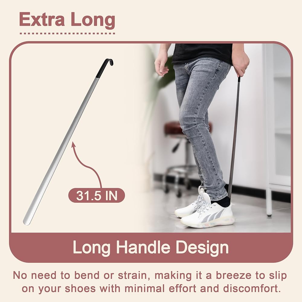 تصميم بمقبض طويل - تصميم بمقبض طويل 31.5 سم يسمح بسهولة الانزلاق على الأحذية دون الانحناء أو الإجهاد، مما يوفر مساعدة مريحة في ارتداء الأحذية بشكل مريح ويجعلها أداة مثالية للأفراد ذوي القدرة المحدودة على الحركة أو المرونة.