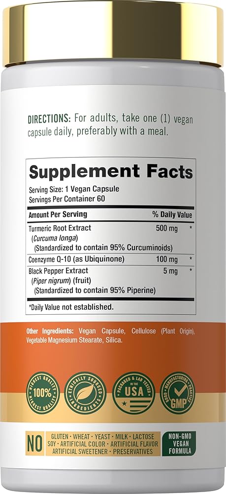 Experience the benefits of this traditional herb with Carlyle today! Vegan capsules deliver 500 mg of Turmeric Root Extract (standardized to contain 95% Curcuminoids), plus CoQ10 and Black Pepper Extract for added support. Our vegan formula is gluten free and non-GMO, made with no artificial color, flavor, sweetener or preservatives, making it an excellent supplement of choice for adult men and women everywhere!