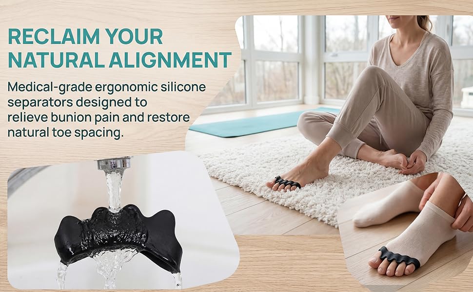 • يعزز المحاذاة الطبيعية: يساعد على استعادة الوضع المناسب لأصابع القدم بمرور الوقت، مما يقلل الضغط ويحسن صحة القدم مع الارتداء المنتظم.