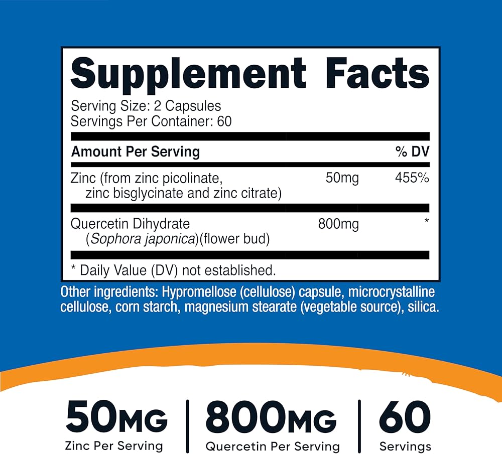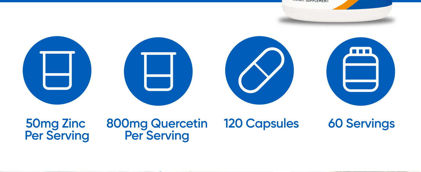 - يوفر 50 ملجم من الزنك و800 ملجم من الكيرسيتين لكل وجبة للحصول على دعم يومي بسيط