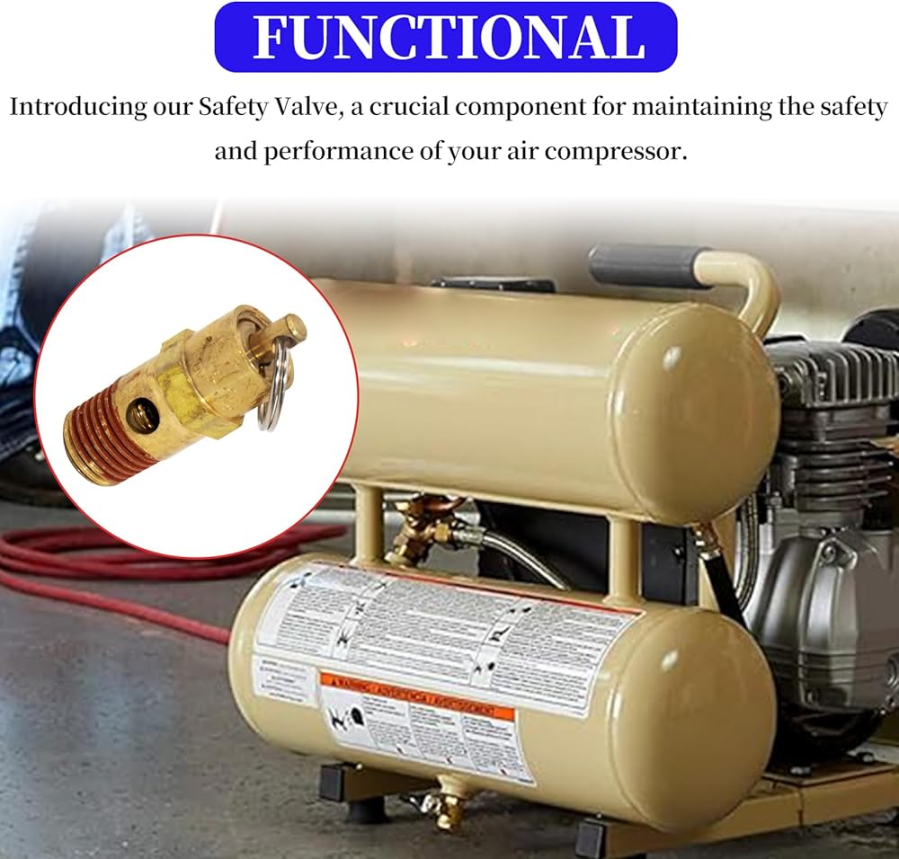Functional: Introducing our Safety Valve, a crucial component for maintaining the safety and performance of your air compressor. It automatically releases excess pressure from the air compressor to prevent over-pressurization, ensuring safe and efficient operation.