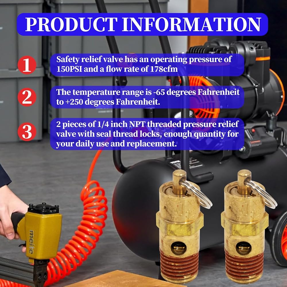 Package Includes: 2 pieces of 1/4 inch NPT threaded pressure relief valve with seal thread locks, enough quantity for your daily use and replacement. It is crucial to regularly check and maintain the safety valve to ensure its effectiveness.