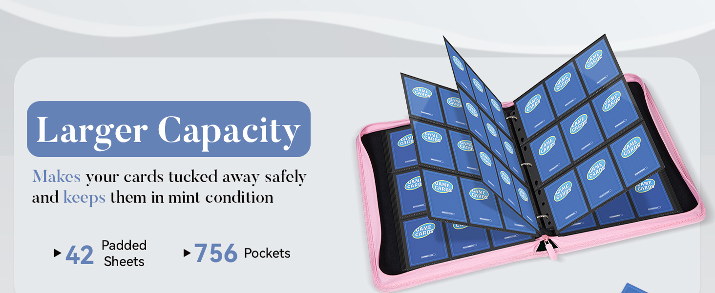 • سعة هائلة تصل إلى 756 بطاقة: تتميز حافظة البطاقات هذه بـ 42 غلافًا مبطنًا لاستيعاب ما يصل إلى 756 بطاقة. يتيح لك التصميم ثلاثي الحلقات إضافة أو إزالة الصفحات بسهولة مع نمو مجموعتك، مما يحافظ على كل شيء منظمًا ومرتبًا