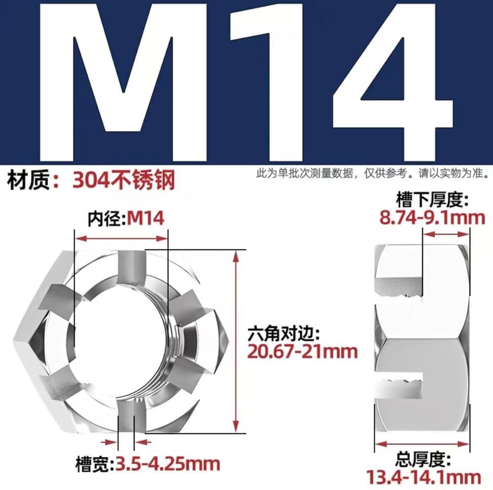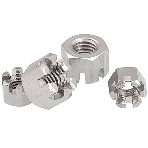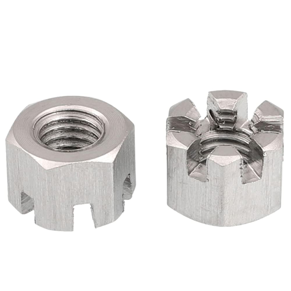• Hex nut with opposed slots cut into the top of the nut through the centers of the flats. The slots are on the end opposite the bearing surface. Material: The T nuts Made from carbon steel, Surface is Nickel-plated and good performance,these nuts have high hardness and a long service life. Commonly used in the automotive industry to secure front wheel bearings / wheel hubs to spindles on cars and trucks. The slots are for the insertion of a cotter pin to secure the nut when used with a drilled