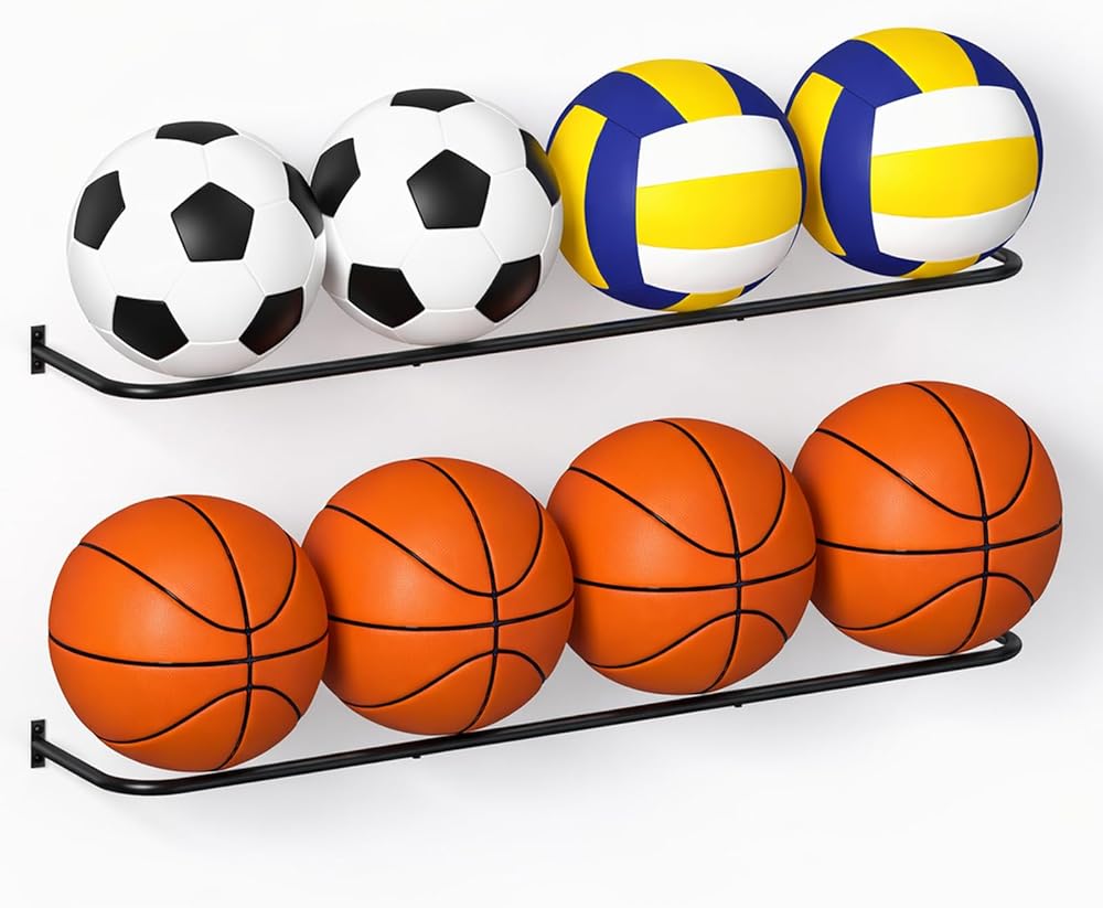 رف الكرة الموفر للمساحة: استعيدي المساحة الأرضية من خلال استخدام مناطق الجدار الرأسية في المرآب أو صالة الألعاب الرياضية المنزلية. تم تصميم تصميم رفوف الكرة المدمجة المثبتة على الحائط خصيصًا للمساحات الضيقة أو التثبيت بين أسطح الجدران. يوفر حلاً بسعة 8 كرات يعمل كمنظم فعال للمعدات الرياضية دون إعاقة الممرات