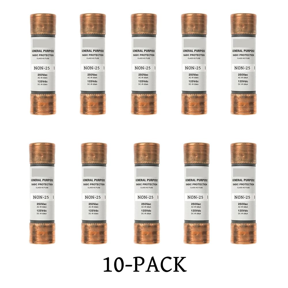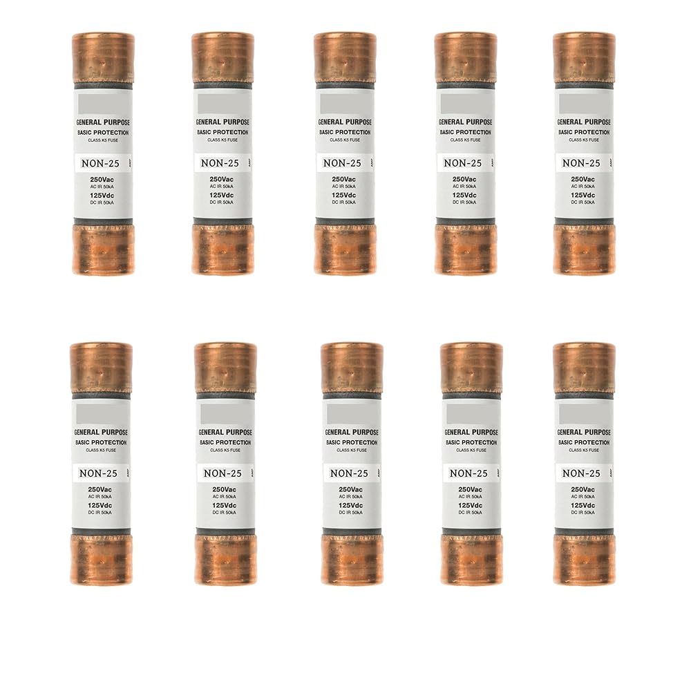 Part number: NON-25A, in box and pack of 10 PACK Protect lighting, heating, and other circuits not subject to temporary surges and where available short-circuit currents are relatively low ONE-TIME fuses do not have a time delay feature and thus should not be specified in circuits where large transients or motor overloads occur For motor circuits, size at 300% to 400%