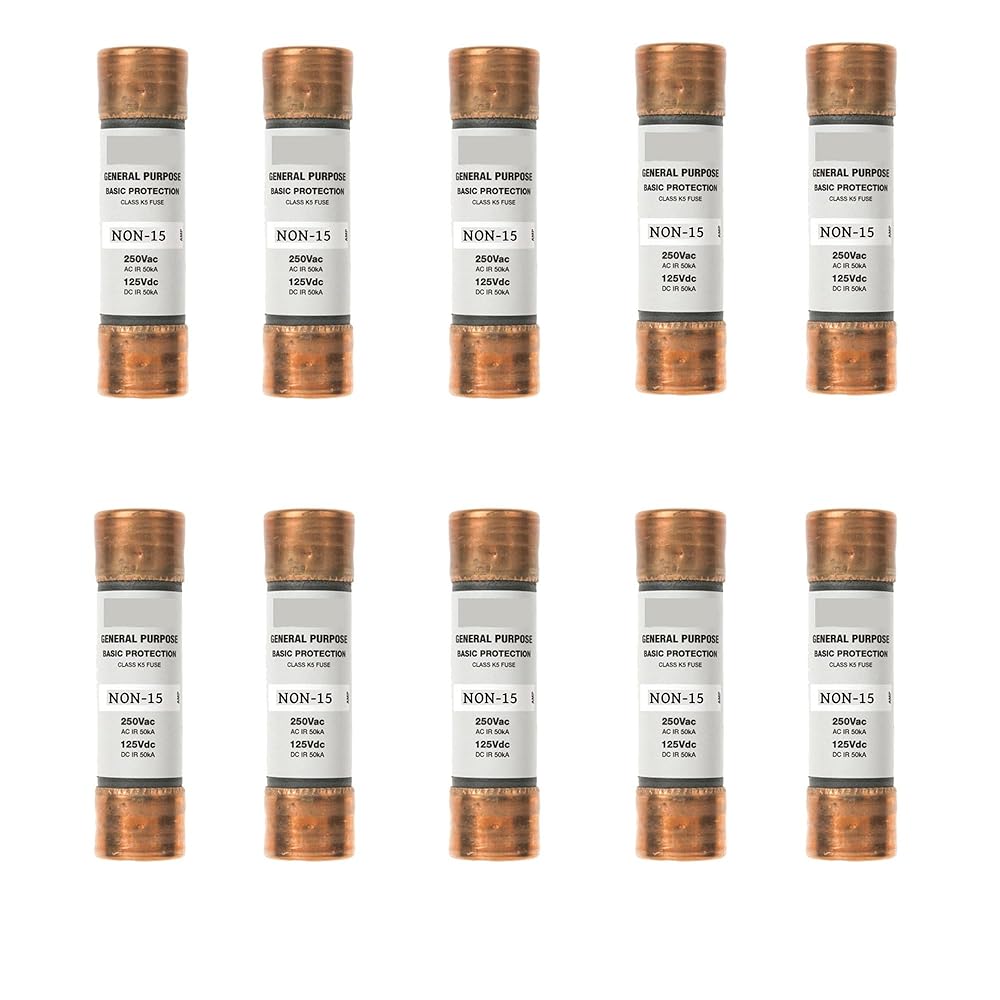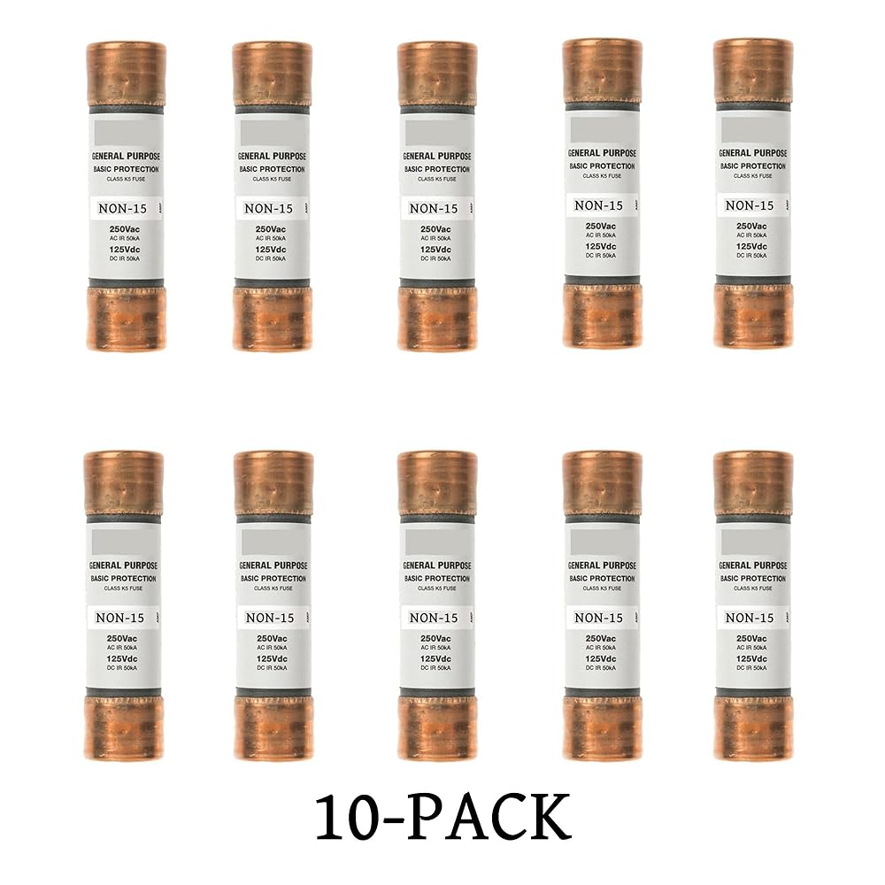 Part number: NON-15A, in box and pack of 10 PACK Protect lighting, heating, and other circuits not subject to temporary surges and where available short-circuit currents are relatively low ONE-TIME fuses do not have a time delay feature and thus should not be specified in circuits where large transients or motor overloads occur For motor circuits, size at 300% to 400%