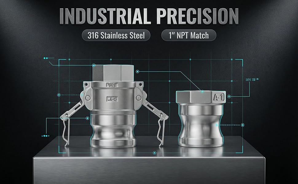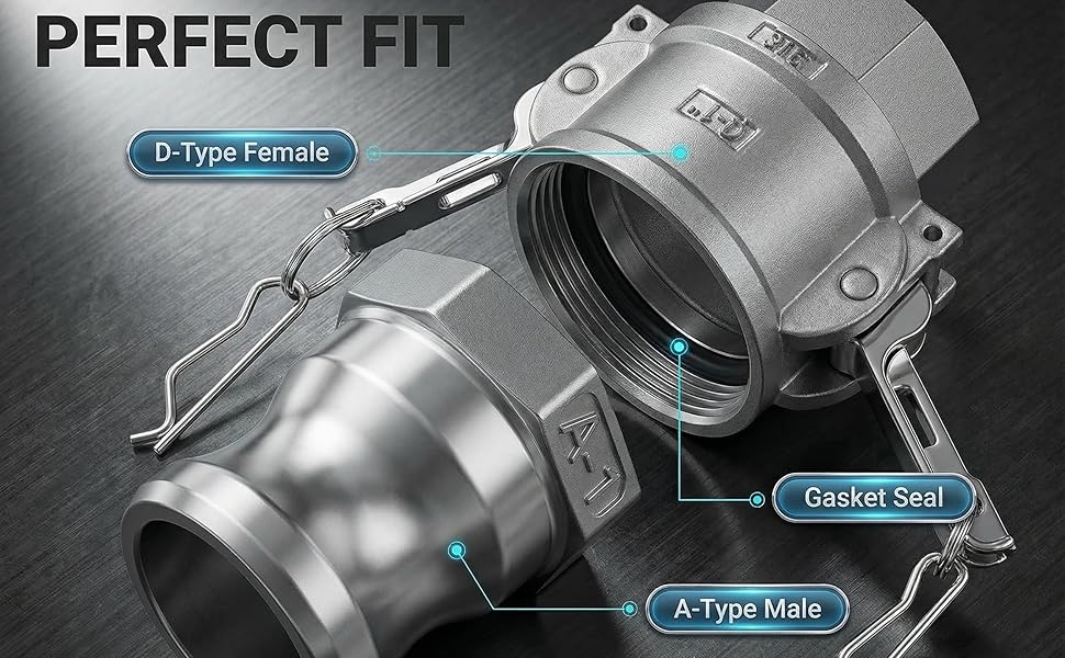 مجموعة المواصفات الدقيقة 1 "NPT: تحتوي هذه المجموعة على تركيب قفل كامة داخلي أنثى من النوع NPT D مقاس 1 بوصة وتركيب خرطوم أخدود خارجي ذكر من النوع A مقاس 1 بوصة NPT A، بالإضافة إلى حشوات الختم المجانية. إنه يتطابق تمامًا مع خطوط أنابيب نقل السوائل من نفس المواصفات، مما يلبي الطلب على اتصالات التوصيل والتشغيل السريعة.