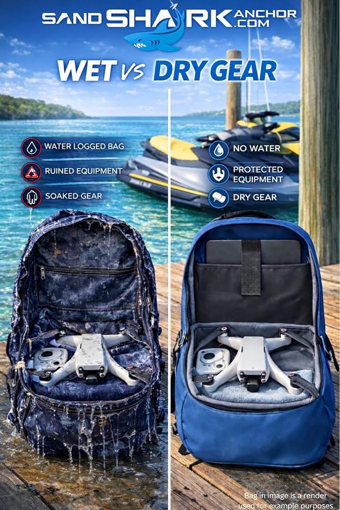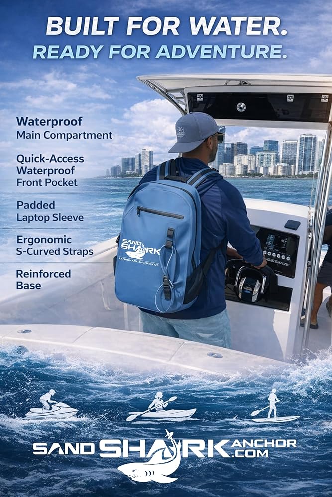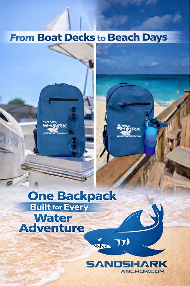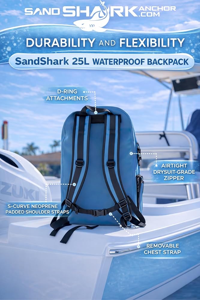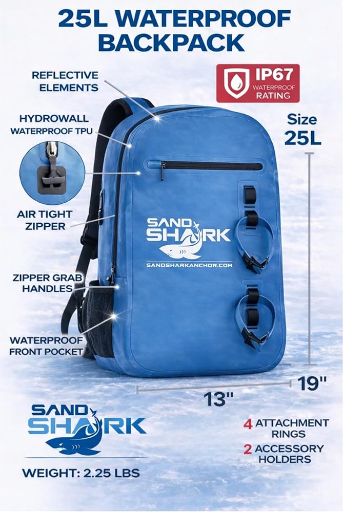 Conquer water. Protect your gear. The SandShark 25L Waterproof Backpack is built for real marine conditions and serious water exposure. Whether you're boating, jet skiing, hitting the beach, or traveling in unpredictable weather, this water proof backpack delivers IP67-rated protection. Constructed with a Hydrowall TPU waterproof shell, welded seams, and an airtight drysuit-grade zipper, this waterproof bag is fully submersible and designed to keep your gear completely dry — no soaked clothes, no ruined electronics. With a 25-liter capacity, this versatile dry bag functions as a waterproof boat bag, swim backpack, and adventure travel pack. The waterproof main compartment includes a padded laptop sleeve, while the quick-access waterproof front pocket keeps essentials secure. Ergonomic S-curve neoprene padded straps, a removable chest strap, and a reinforced base provide comfort and durability on docks, decks, and sand. Lightweight at just 2.25 lbs, it's built for every water adventure.IP67 waterproof backpack (fully submersible) -Hydrowall TPU waterproof shell -Airtight drysuit-grade zipper -Welded seams construction -25L capacity (19” x 13”) -Padded laptop sleeve -Waterproof front pocket -4 attachment rings & 2 accessory holders -Reinforced base -Lightweight – 2.25 lbs