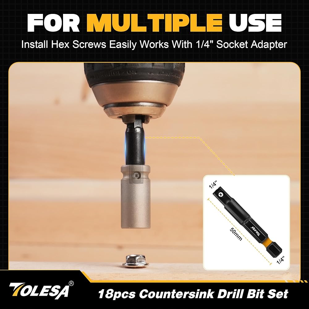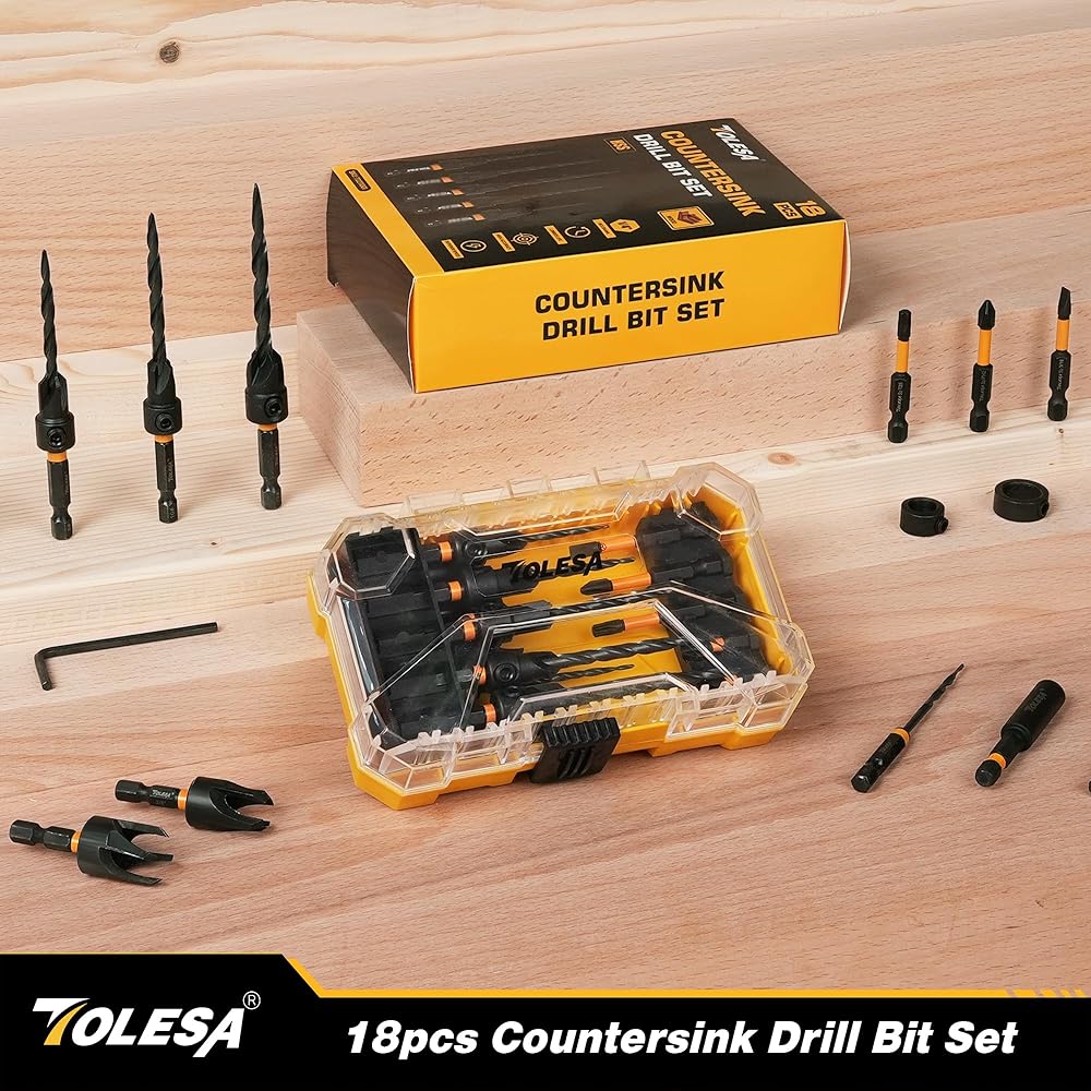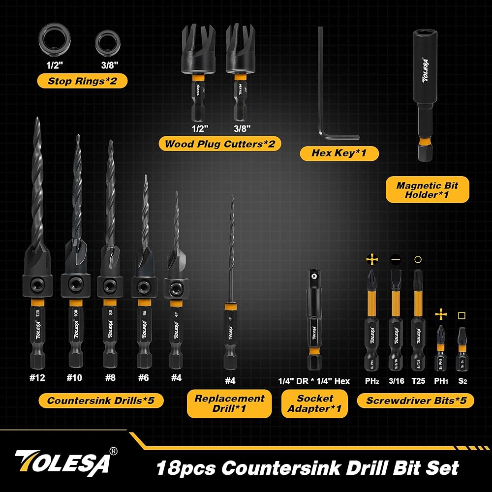 【مجموعة كاملة مكونة من 18 قطعة】تتضمن مجموعة رؤوس المثقاب الغاطسة من TOLESA 5 رؤوس مثقاب مدببة: #4 (7/64 بوصة)، #6 (9/64 بوصة)، #8 (11/64 بوصة)، #10 (3/16 بوصة)، #12 (7/32 بوصة)؛ 1 بديل #4؛ 2 قاطعة سدادة خشبية: 3/8 بوصة، 1/2 بوصة؛ حلقتان لإيقاف العمق: 3/8 بوصة 1/2 بوصة؛ 5 رؤوس مفك براغي؛ 1 مفتاح سداسي؛ 1 وصلة مغناطيسية؛ 1 محول مقبس، كل ذلك في حقيبة تخزين متينة.