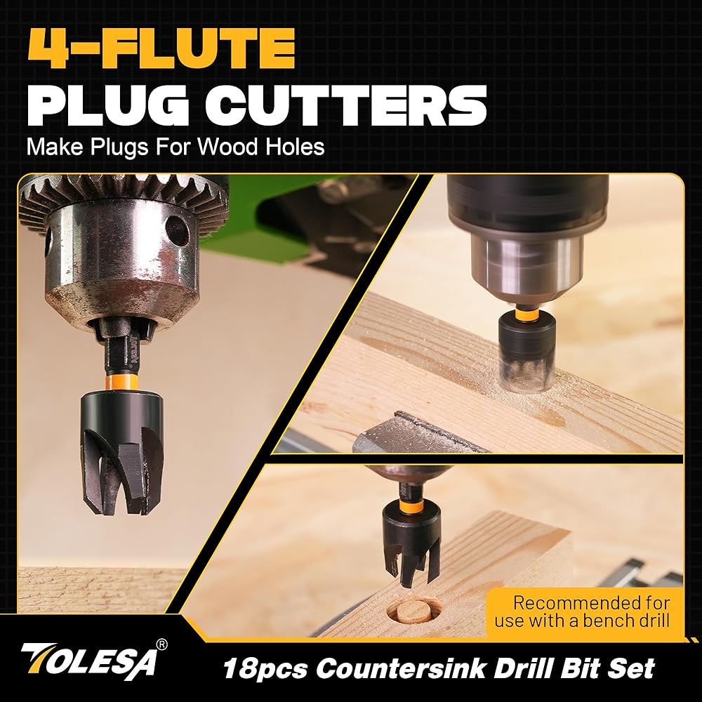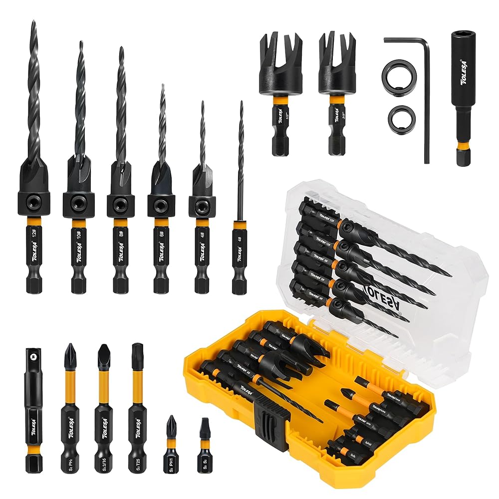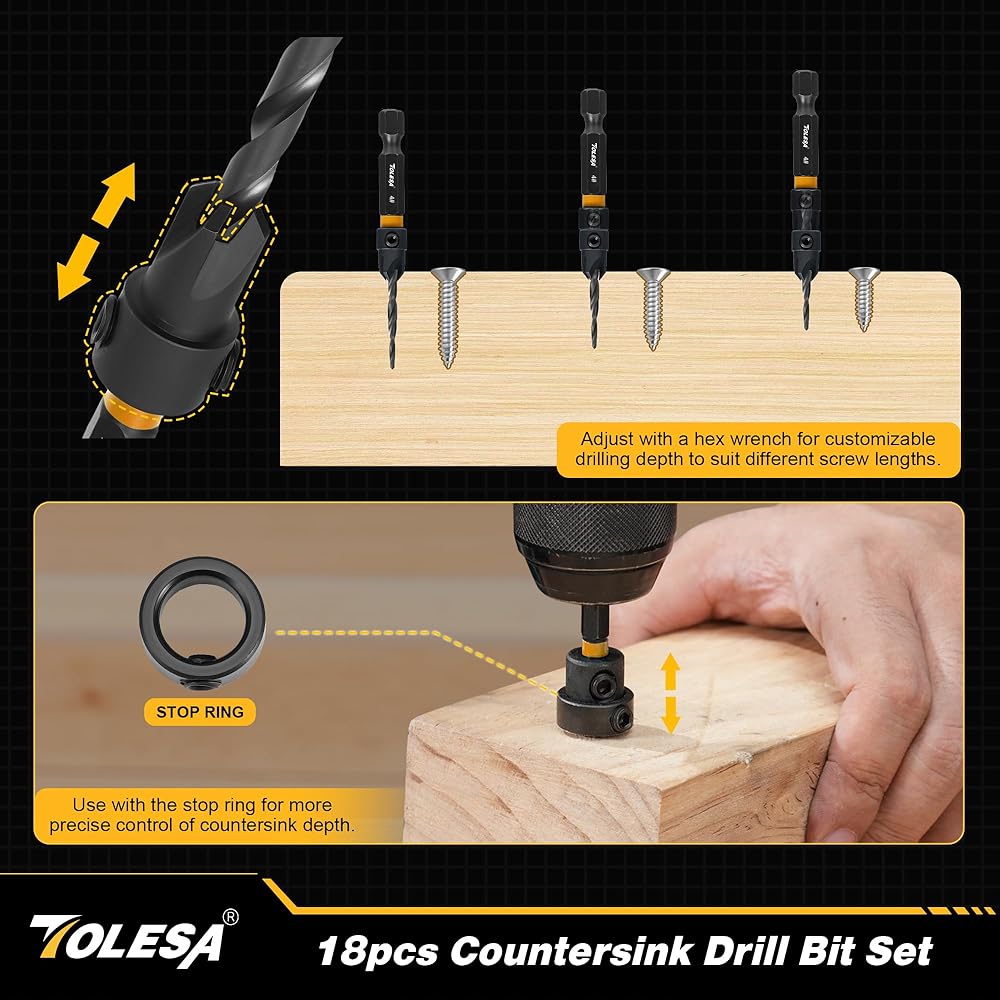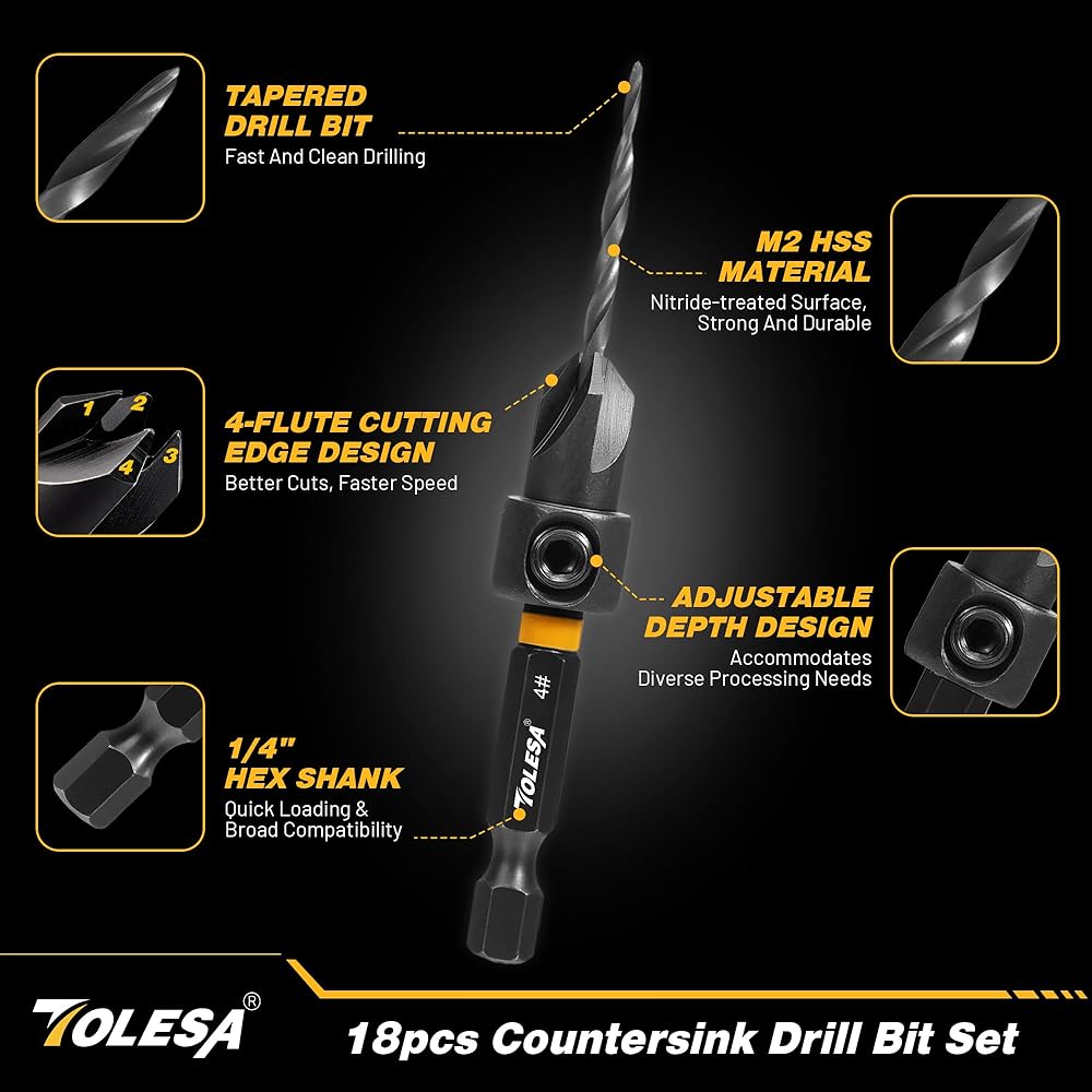 【مجموعة كاملة مكونة من 18 قطعة】تتضمن مجموعة رؤوس المثقاب الغاطسة من TOLESA 5 رؤوس مثقاب مدببة: #4 (7/64 بوصة)، #6 (9/64 بوصة)، #8 (11/64 بوصة)، #10 (3/16 بوصة)، #12 (7/32 بوصة)؛ 1 بديل #4؛ 2 قاطعة سدادة خشبية: 3/8 بوصة، 1/2 بوصة؛ حلقتان لإيقاف العمق: 3/8 بوصة 1/2 بوصة؛ 5 رؤوس مفك براغي؛ 1 مفتاح سداسي؛ 1 وصلة مغناطيسية؛ 1 محول مقبس، كل ذلك في حقيبة تخزين متينة.