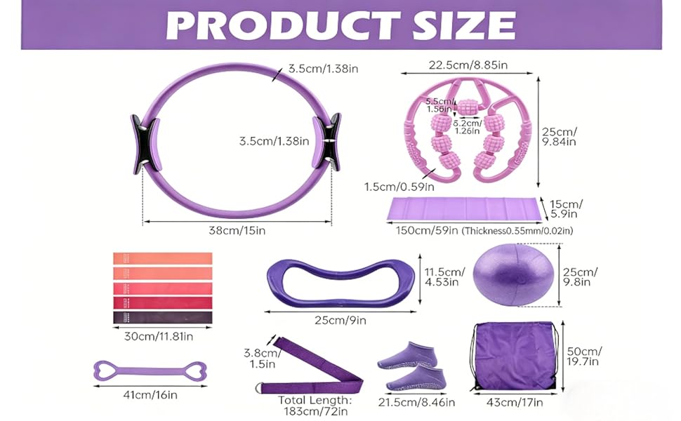 【14 قطعة بيلاتيس الكل في واحد】مجموعة بيلاتيس أساسية للمبتدئين. تتضمن 1 دائرة بيلاتيس، 1 كرة يوجا، 1 حقيبة تخزين للياقة البدنية، 1 زوج من الجوارب المضادة للانزلاق، 1 مشبك ساق، 1 شريط مطاطي، 1 حلقة يوغا، 5 أشرطة مقاومة، 1 شريط مقاومة على شكل 8، 1 حزام تمديد لليوجا.