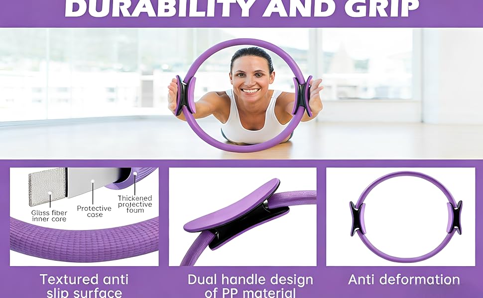 【المتانة والقبضة】تتميز دائرة البيلاتس المعززة بالألياف الزجاجية بسطح محكم غير قابل للانزلاق لأداء دائم. يضمن تصميمه ذو المقبض المزدوج، المصنوع من مادة البولي بروبيلين، الراحة والقبضة الآمنة أثناء التمرينات. فهو مقاوم للتشوه، ويوفر وظائف موثوقة عبر التمارين المتنوعة ومستويات القوة.