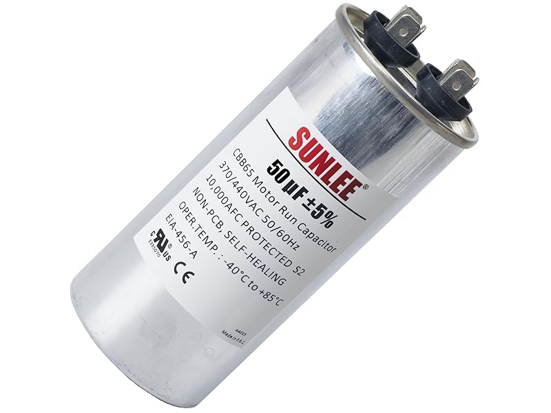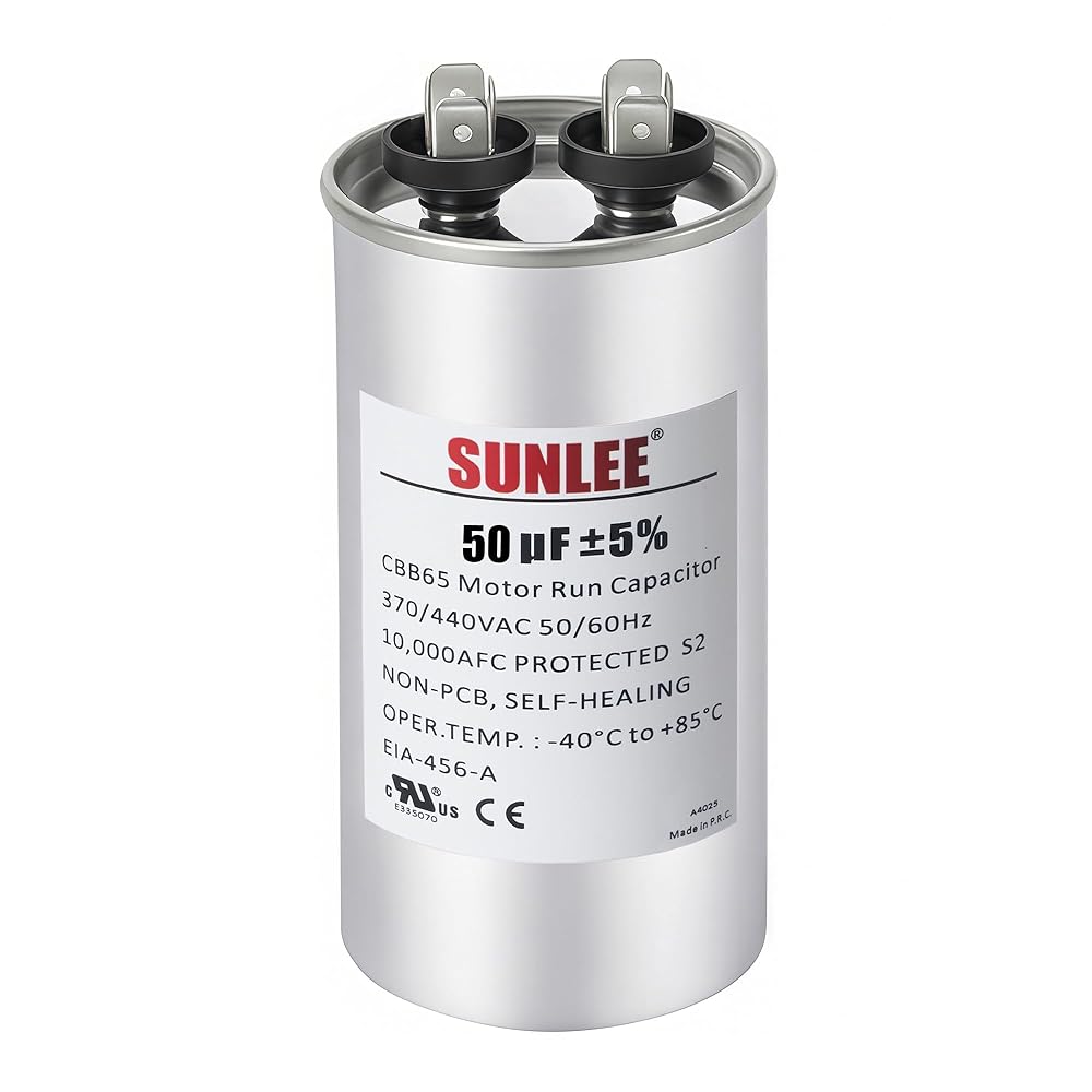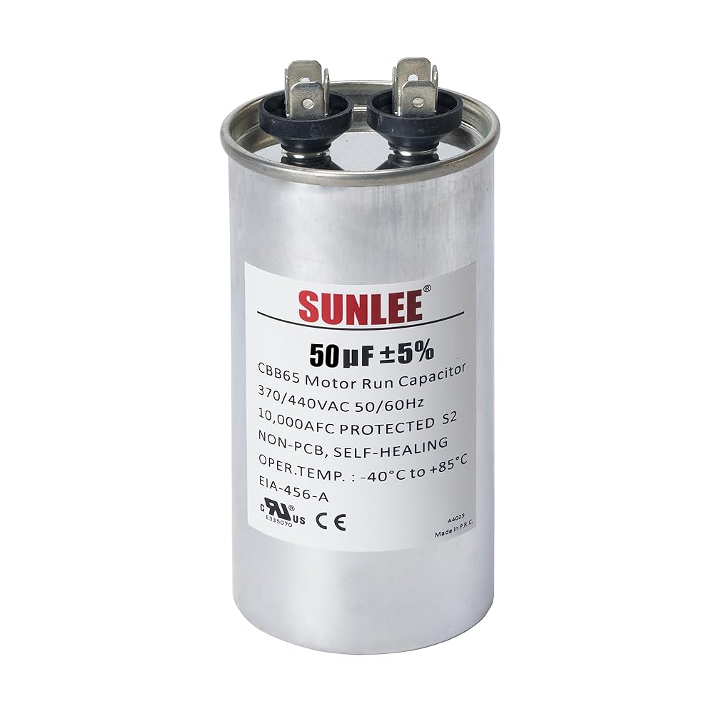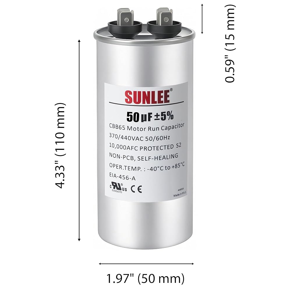 استبدال مكثف التشغيل SUNLEE 50 فائق التوهج ±5% 370/440 VAC CBB65 لكل من المكثفات 370 و440 فولت.