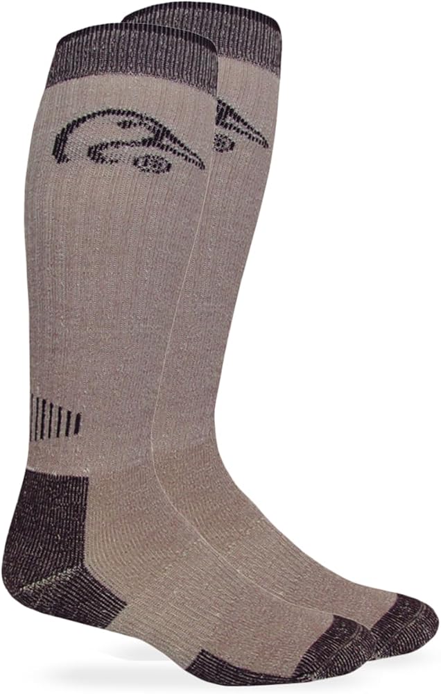 Ducks Unlimited Men's Merino Wool All Season Outdoor Tall Boot Socks 1 Pair Pack features midweight construction, premium merino wool, moisture wicking properties, thermal warmth, full cushion leg and foot padding comfort, arch support, reinforced heel and toe, stay-up top, and tall crew boot length. These socks are all season wear for all climate weather that provide comfort, warmth, and support. Perfect for outdoor wear, waterfowl hunters, fly fishing, outdoors, work, combat boots, hiking, duck hunting, camping, trekking, rucking, trail walking, tall boots, work boots, and everyday wear. Made in USA.