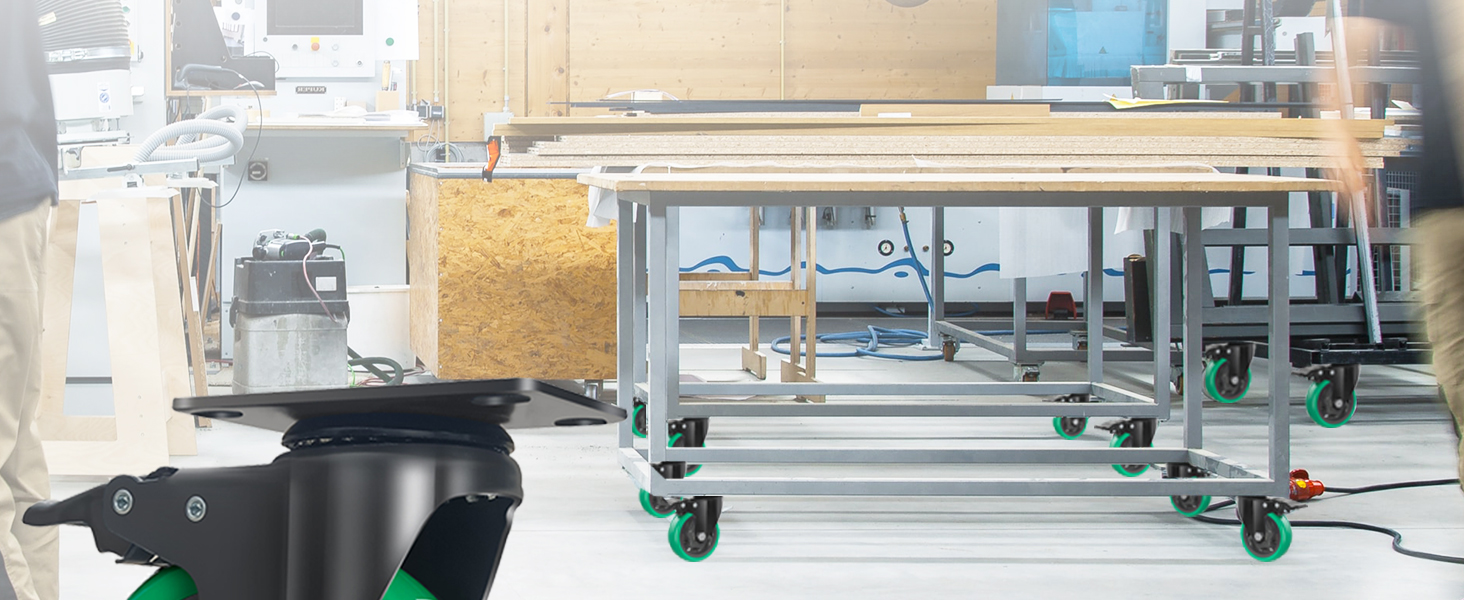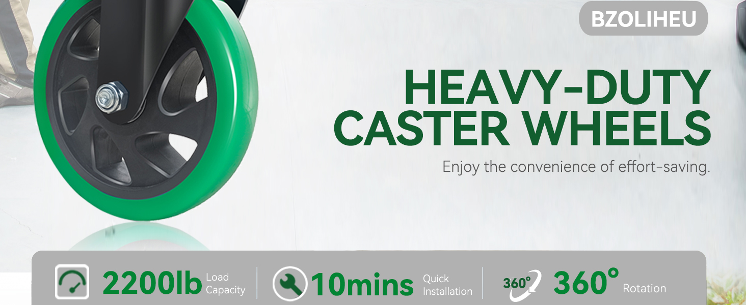 عجلات متينة وشديدة التحمل: تتميز عجلات العجلات الخاصة بنا بهيكل فولاذي سميك، ولوحة علوية فولاذية سميكة، ومحامل كروية مزدوجة، مما يضمن أن العجلات يمكن أن تكون متينة وقوية للغاية. يمكن لكل عجلات عجلات مقاس 5 بوصات حمل 550 رطلاً، وسعة الحمل الإجمالية تصل إلى 2200 رطل