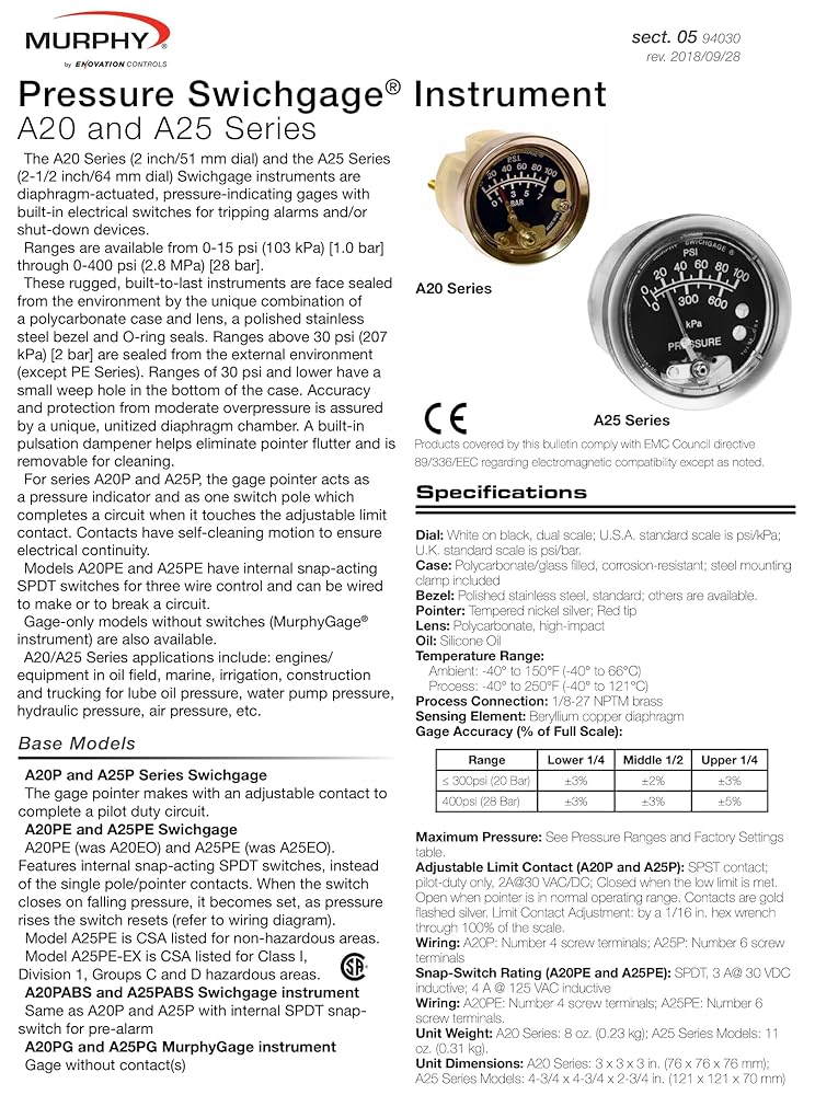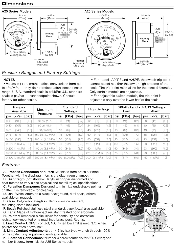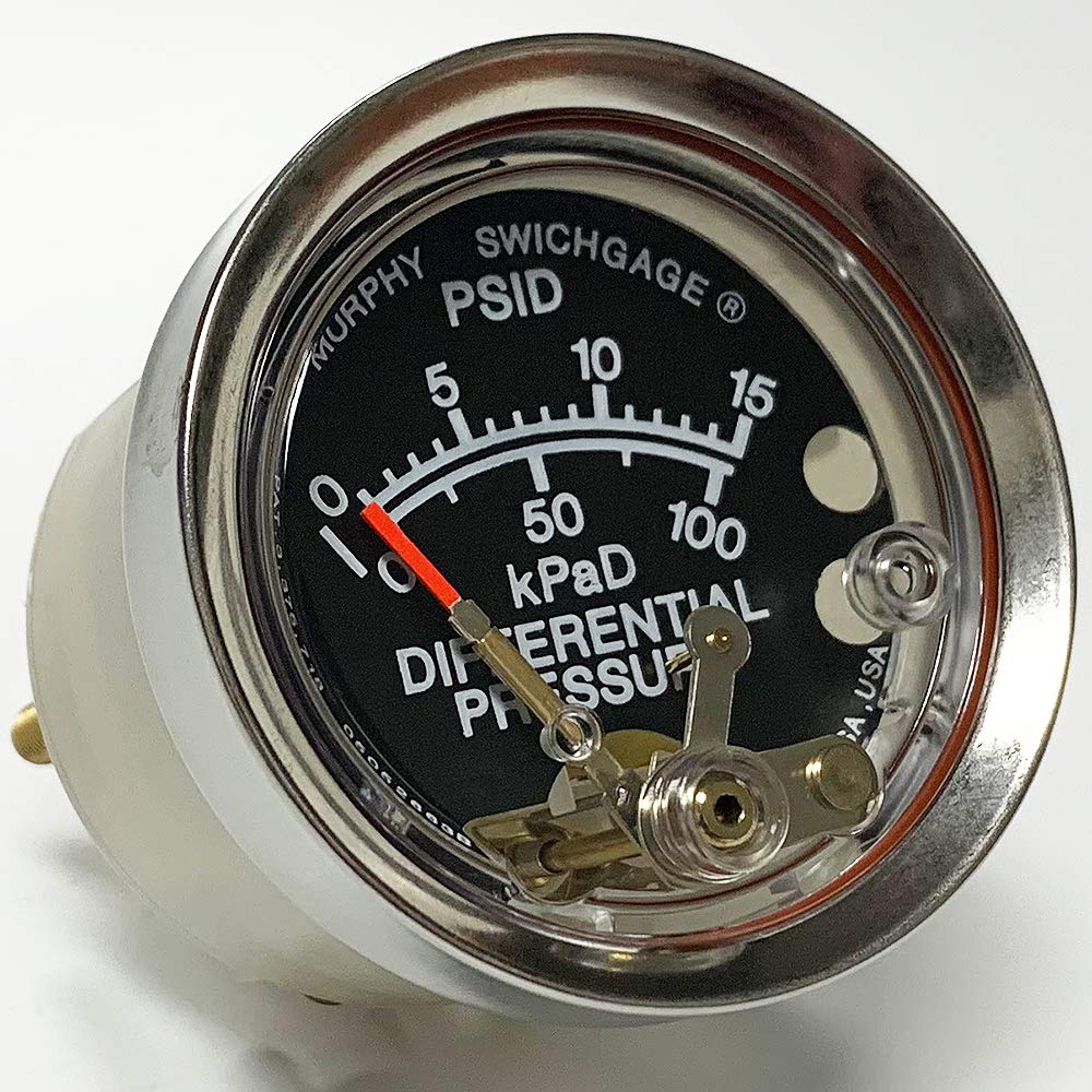 The A20DP-15 Differential Pressure Swichgage is a 2" dial, diaphragm-actuated differential pressure-indicating gage. The built-in switch is used for tripping alarms and/or shutting down equipment. This dual-scale instrument has a polycarbonate case and lens for complete environmental protection and a range of 0-15 psi.