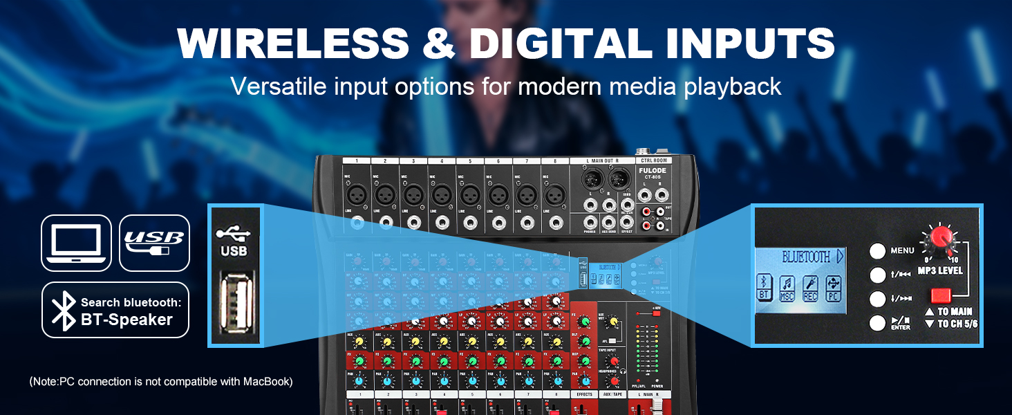 اتصال متعدد الأجهزة: يمكنك توصيل محركات أقراص USB أو مشغلات MP3 أو أجهزة Bluetooth بسهولة للحصول على خيارات تشغيل مرنة. تسمح عناصر التحكم البديهية باختيار المسار السريع، وتبديل الوضع، والتسجيل، بينما توفر شاشة LED الكبيرة عملية واضحة في لمحة.