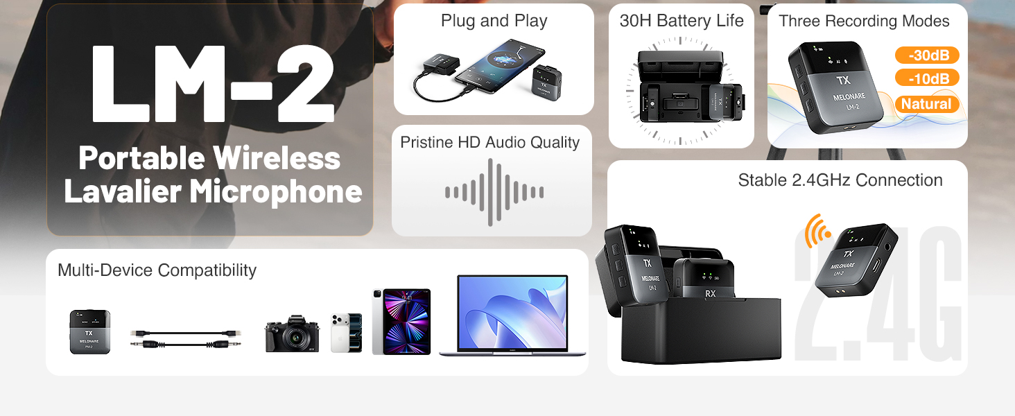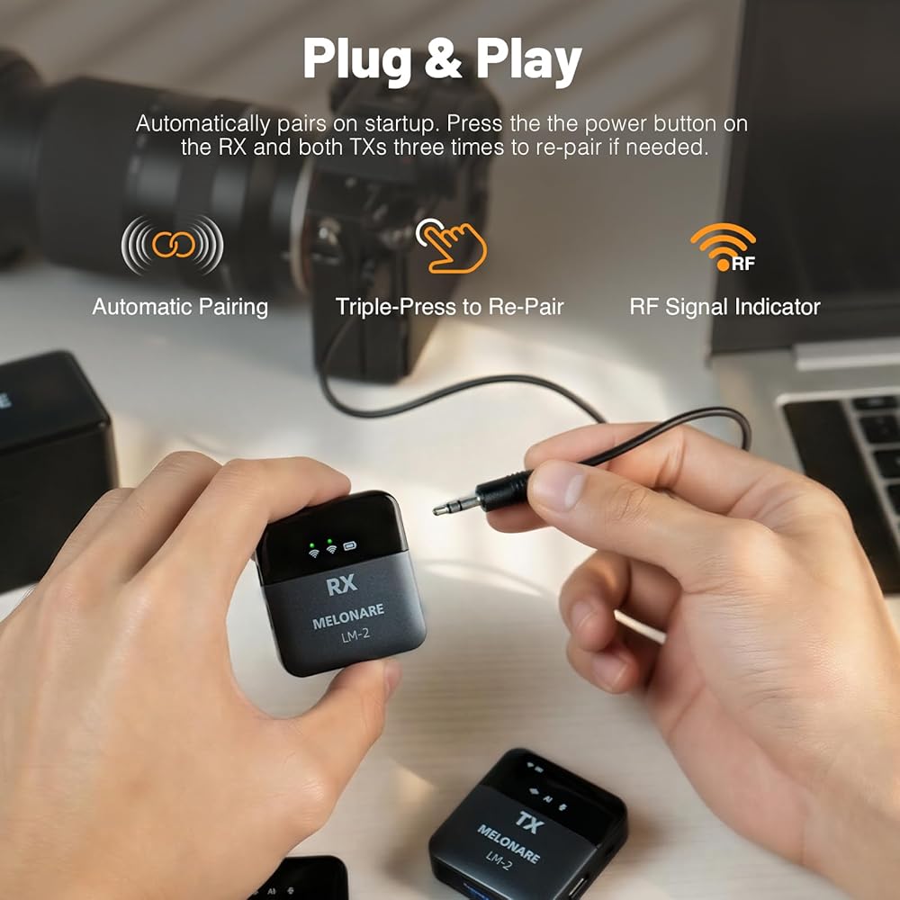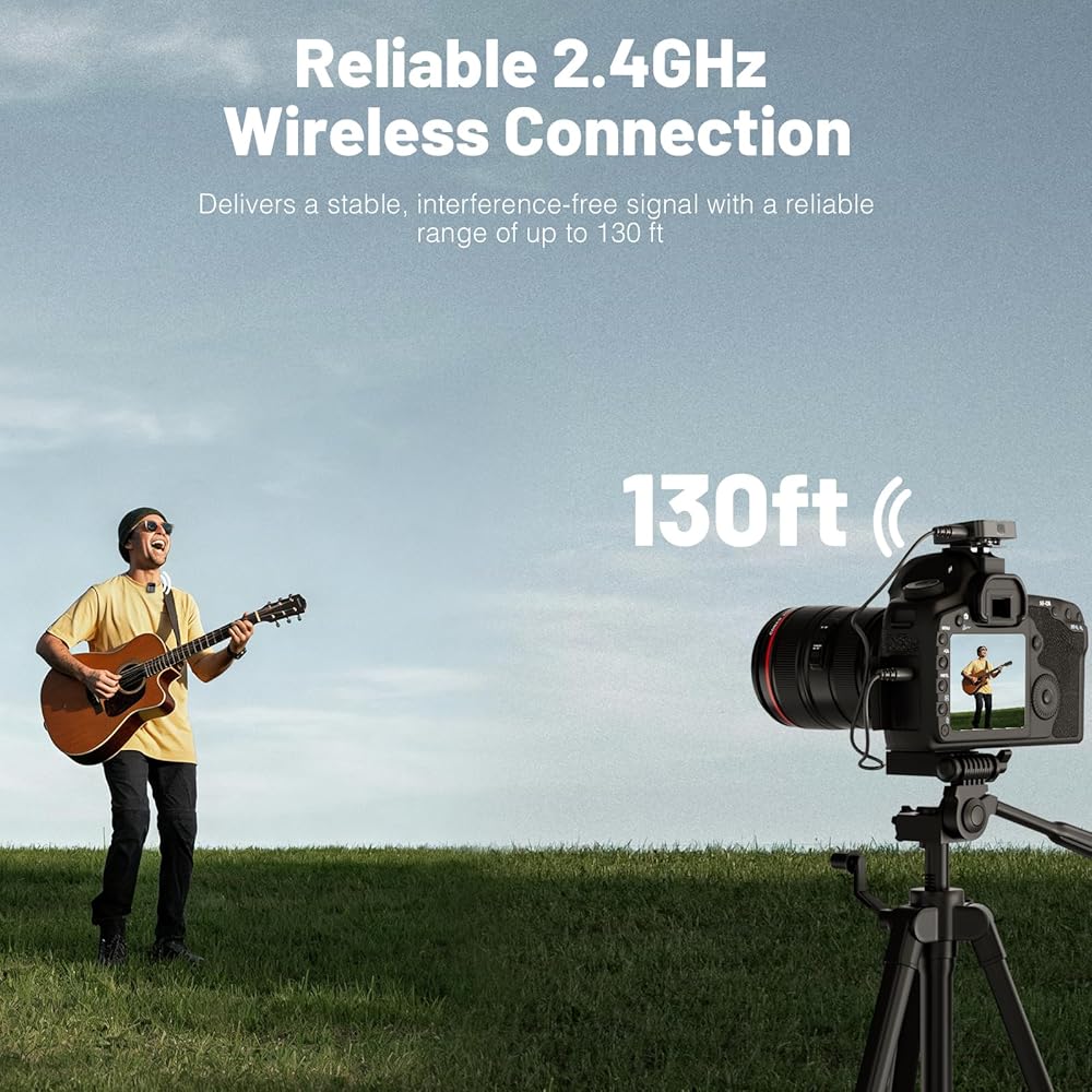 أداء لاسلكي ثابت بتردد 2.4 جيجا هرتز: مع ناقل الحركة الموثوق به بتردد 2.4 جيجا هرتز، يدعم إعداد الميكروفون ذو جهاز الإرسال المزدوج والمستقبل الفردي الاقتران التلقائي عند بدء التشغيل لتشغيل التوصيل والتشغيل الحقيقي. إذا لزم الأمر، تعمل النقرة الثلاثية على إعادة إقران الأجهزة بسرعة، مما يضمن اتصالاً مستقرًا بطول 30 إلى 40 مترًا، وهو مثالي للتصوير الخارجي واللقطات ذات الزاوية الواسعة.