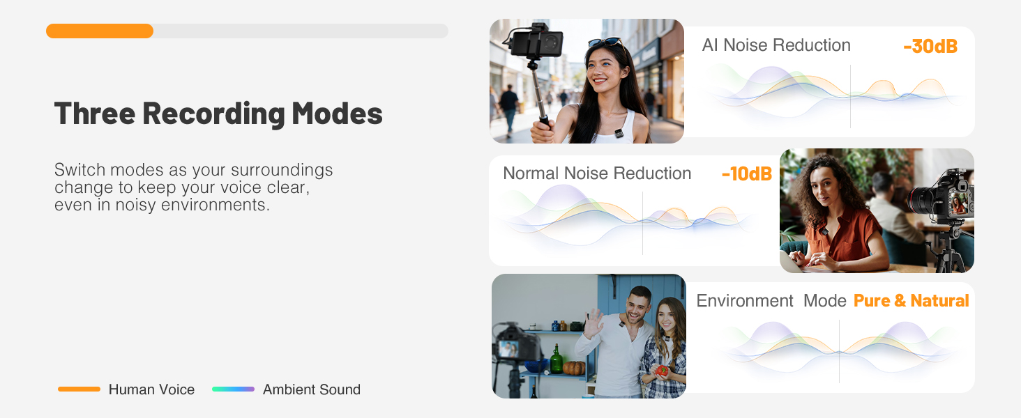 ثلاثة أوضاع للتسجيل: يوفر نظام الميكروفون اللاسلكي ثلاثة أوضاع للتسجيل - وضع البيئة، وتقليل الضوضاء العادية، وتقليل الضوضاء بالذكاء الاصطناعي. يعمل NR العادي على خفض الضوضاء بمقدار 10 ديسيبل، بينما يوفر NR AI تقليلًا يصل إلى 30 ديسيبل للغناء الواضح في البيئات الصاخبة. مع إيقاف تشغيل ميزة تقليل الضوضاء، يتحول الميكروفون إلى وضع البيئة، مما يحافظ على الأجواء الطبيعية. سواء كنت في شارع صاخب أو في مكان هادئ، يتكيف الميكروفون بسهولة للحصول على صوت واضح وموثوق.