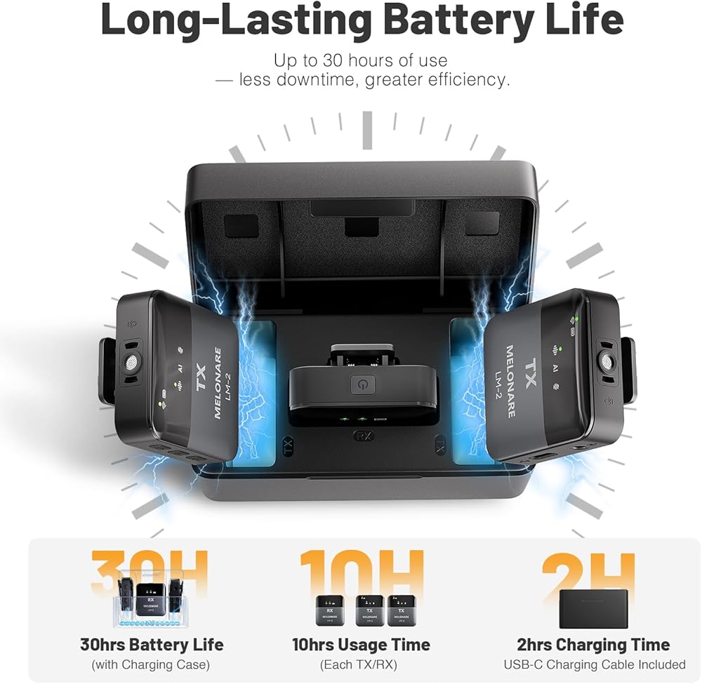 بطارية قابلة لإعادة الشحن تدوم طويلاً: يوفر كل جهاز إرسال وجهاز استقبال ما يصل إلى 10 ساعات من الاستخدام المتواصل، بينما توفر علبة الشحن عالية السعة 2000 مللي أمبير في الساعة ما يصل إلى 30 ساعة من وقت التشغيل الإجمالي ويمكنها إعادة شحن كل من أجهزة الإرسال 300 مللي أمبير وجهاز الاستقبال 300 مللي أمبير في الساعة مرتين. يقلل إعداد الميكروفون اللاسلكي هذا من الحاجة إلى الشحن المتكرر، وهو مثالي للتدريبات الطويلة والمؤتمرات والعروض الحية.