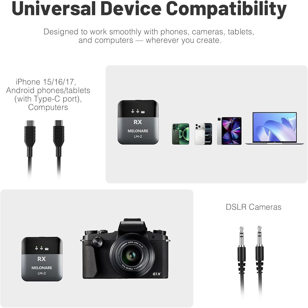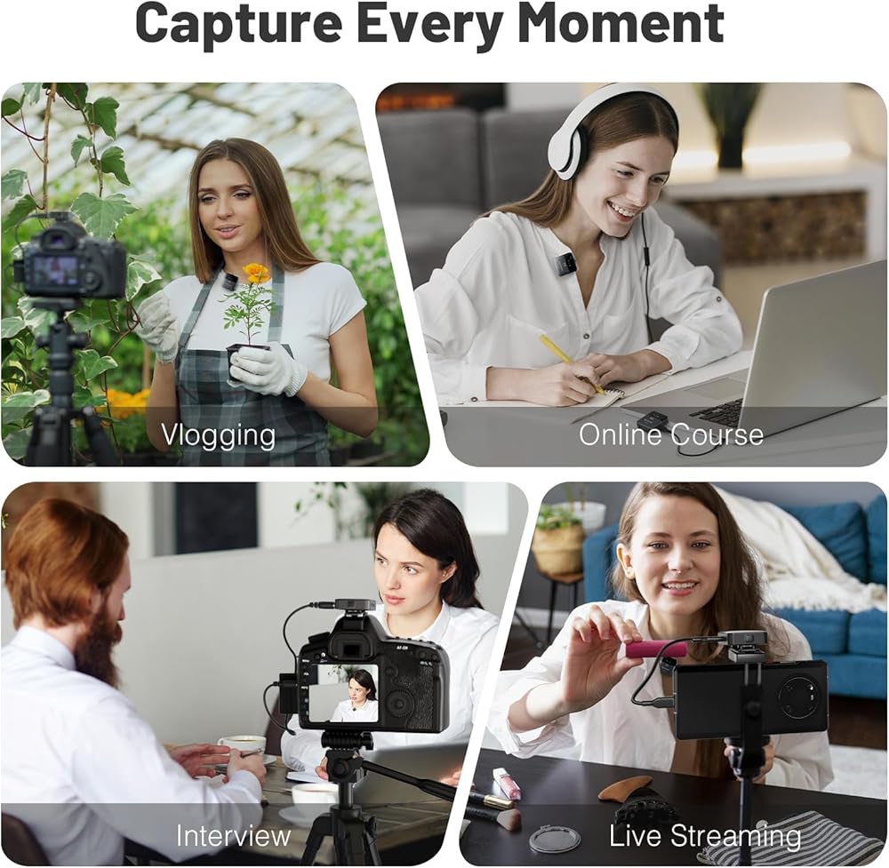 توافق عالمي وتصميم محمول: مع كابلات Type-C OTG و3.5 مم، يعمل هذا الميكروفون اللاسلكي بسلاسة مع هواتف Android والأجهزة اللوحية ذات منافذ Type-C، وسلسلة iPhone 15/16/17، وكاميرات DSLR، وأجهزة الكمبيوتر، مما يوفر توافقًا واسعًا للتوصيل والتشغيل. يظل تصميم المشبك خفيف الوزن مثبتًا بشكل آمن، مما يجعله مثاليًا للمدونين وKOCs ومبدعي السفر لحمله من أجل تصوير مريح.