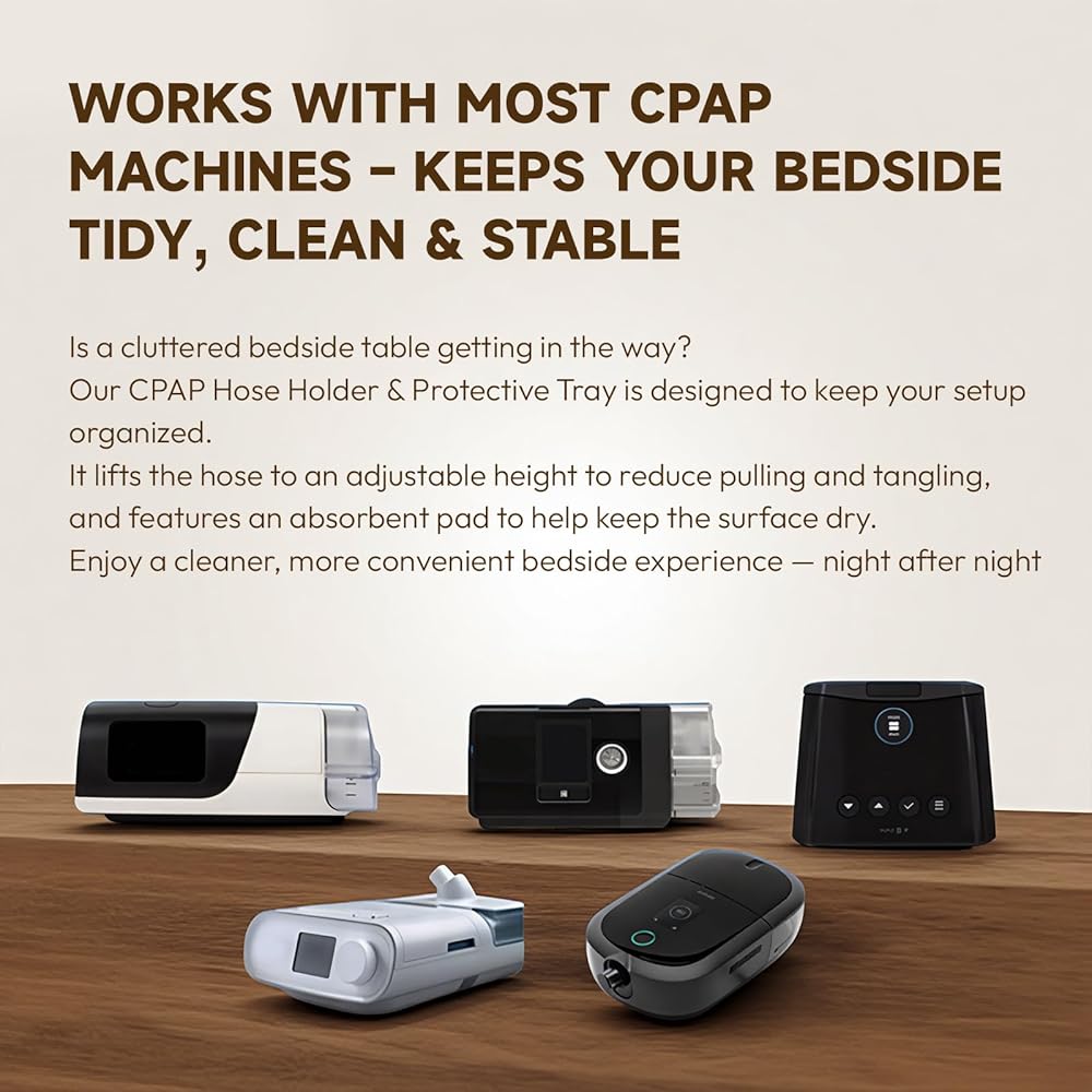 • يبقى في مكانه ويناسب معظم الآلات: أربع وسادات سيليكون غير قابلة للانزلاق في الجزء السفلي تمنع الصينية من الانزلاق على طاولات النوم، ويمكن تركيب عمود التعليق على كلا الجانبين - أيهما أكثر ملاءمة لك - ويمكن إزالته عند عدم الحاجة إليه. يعمل مع جميع أجهزة CPAP الرئيسية