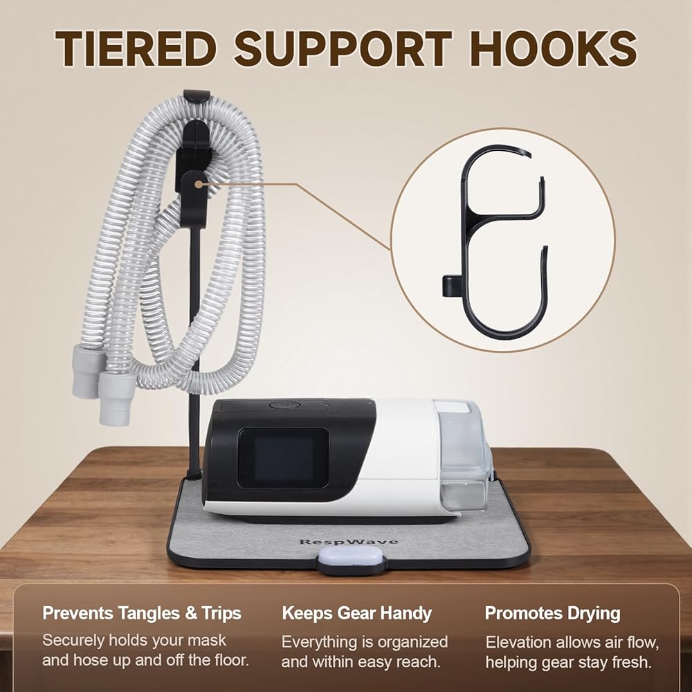 • يحمل الخرطوم حتى يجف ويقلل الرطوبة: تقوم الشماعة القابلة للتعديل برفع الأنبوب والقناع عن المنضدة. يتيح ذلك تدفق الهواء من حولهم، مما يساعد على تجفيف الرطوبة بشكل أسرع وتقليل تراكم الماء في الخرطوم من أجل نوم أكثر نظافة وراحة