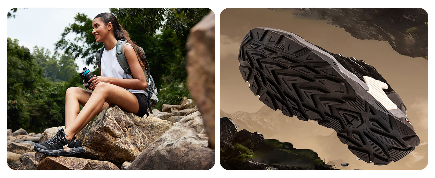 【متينة وغير قابلة للانزلاق】أحذية الرحلات النسائية هذه بنعل مطاطي متين يوفر احتكاكًا موثوقًا في مختلف التضاريس، مما يسمح لك بالاستمتاع بمغامرات المشي لمسافات طويلة بثقة وثبات. رفيق جدير بالثقة لجميع رحلاتك