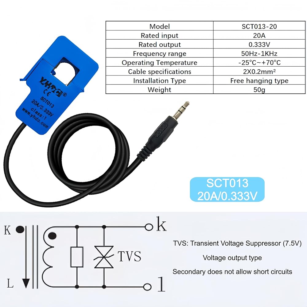 • Input Current: 20A AC, Output Voltage: 0.333V. Model: SCT013.