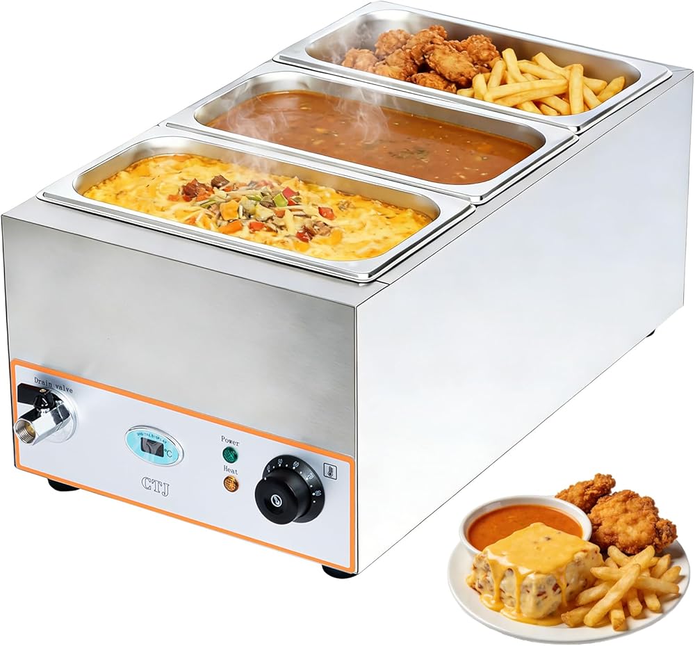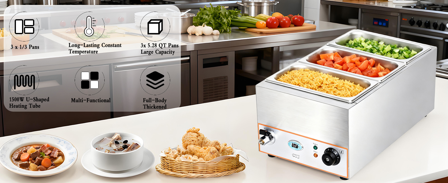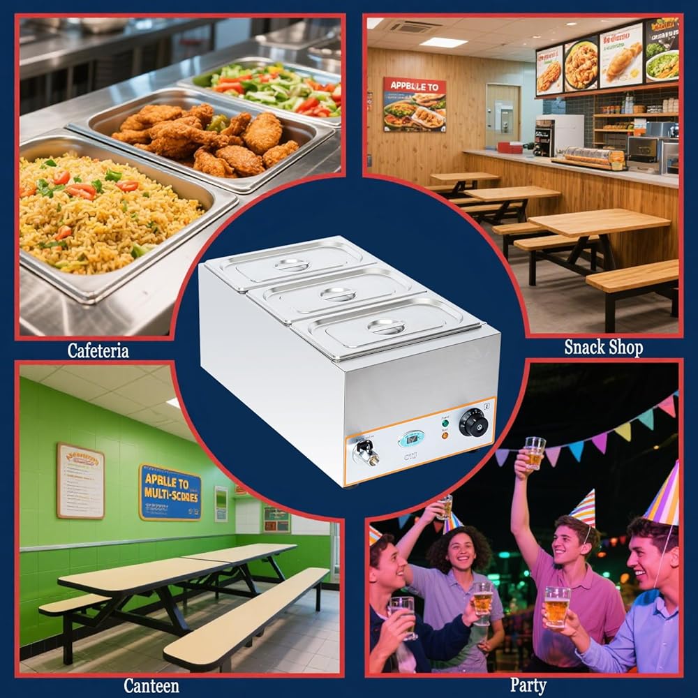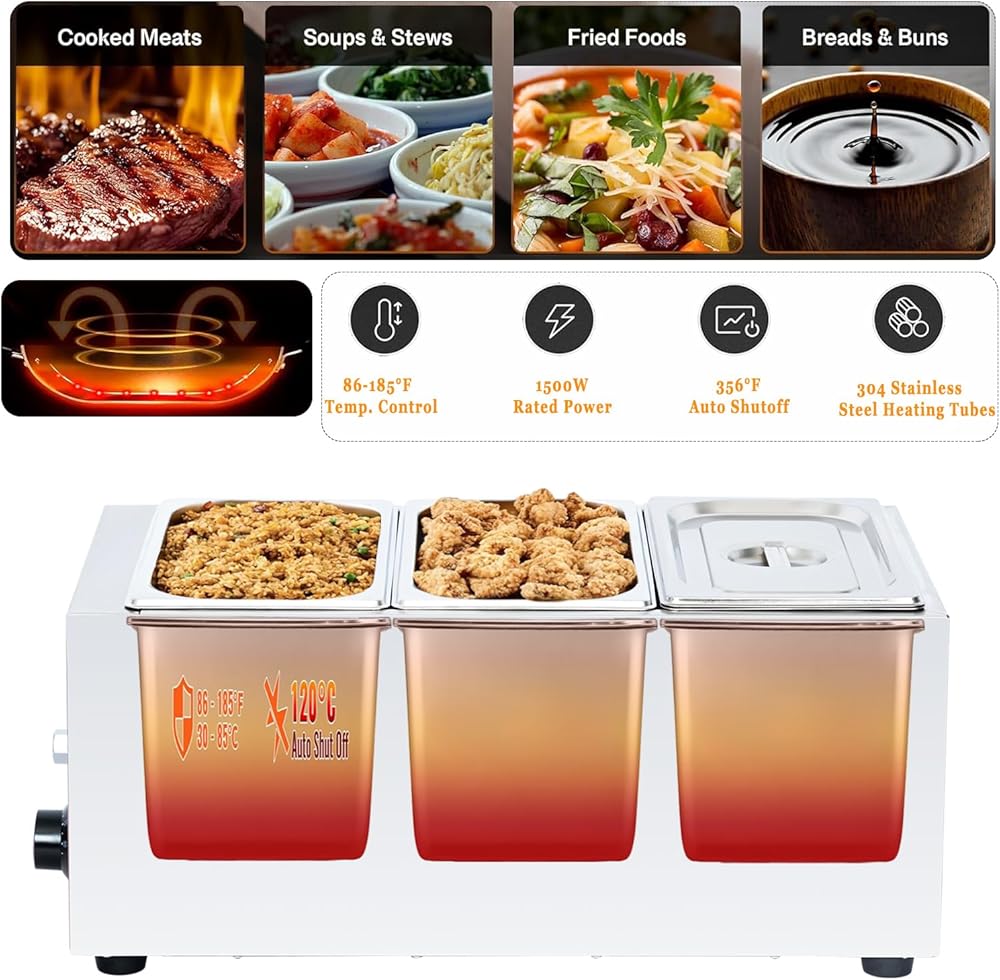 تطبيق متعدد الاستخدامات: يشتمل سخان الطعام الكهربائي هذا على ثلاث مقالي من الفولاذ المقاوم للصدأ مقاس 1/3 (5L = 5.28 QT) (غير لاصقة لسهولة التنظيف). يتيح لك تصميمه المجزأ ذو السعة الكبيرة الحفاظ على دفء الحساء أو الصلصات أو الأطباق الساخنة في نفس الوقت - وهو مثالي للبوفيهات ومطابخ المطاعم وما إلى ذلك.