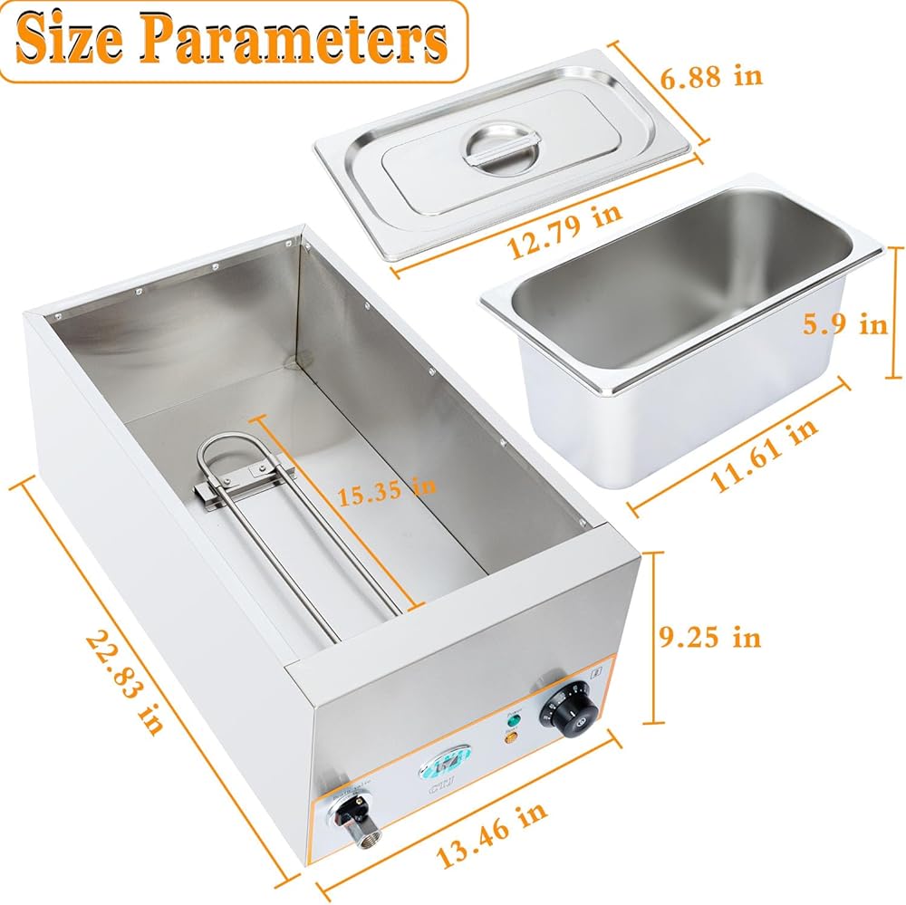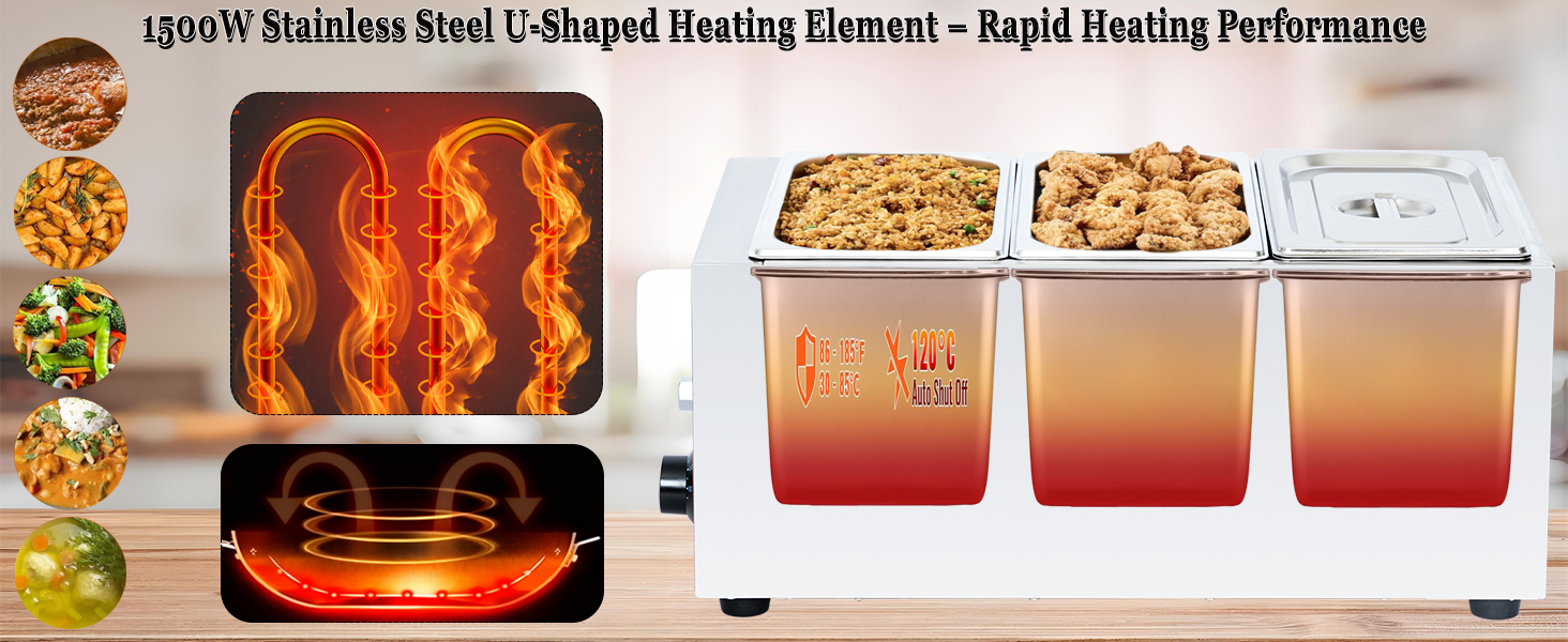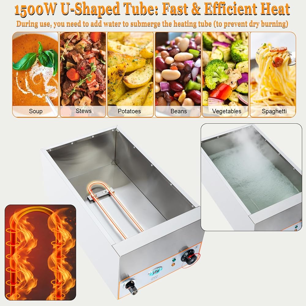 تسخين سريع: يحتوي سخان الطعام التجاري هذا على عنصر تسخين على شكل حرف U من الفولاذ المقاوم للصدأ بقدرة 1500 وات (تخطيط دائري لتوزيع الحرارة الأقصى)، مما يتيح تسخينًا سريعًا وموحدًا. يصل بسرعة إلى درجة الحرارة المستهدفة للحفاظ على نكهة الطعام والحفاظ على الدفء المستمر (بدون بقع ساخنة/باردة). (ملاحظة: قم بإزالة الغشاء الواقي (للوقاية من الخدوش أثناء النقل) قبل الاستخدام الأول.)