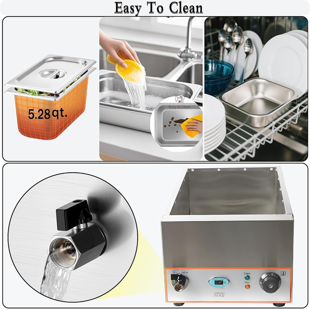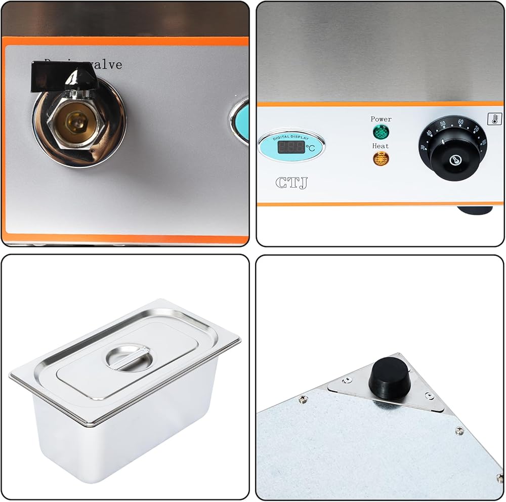 مواد متينة وآمنة: هذا البان ماري وثلاثة مقالي مقاس 1/3 مصنوعة من الفولاذ المقاوم للصدأ الفاخر - مقاومة للتآكل، وسهلة التنظيف، مع توصيل حراري رائع. يحتوي على حماية مدمجة من الحروق الجافة من أجل السلامة وعمر أطول. (ملاحظة: أضف الماء لغمر أنبوب التسخين للحصول على حماية فعالة من الحروق الجافة أثناء الاستخدام.)