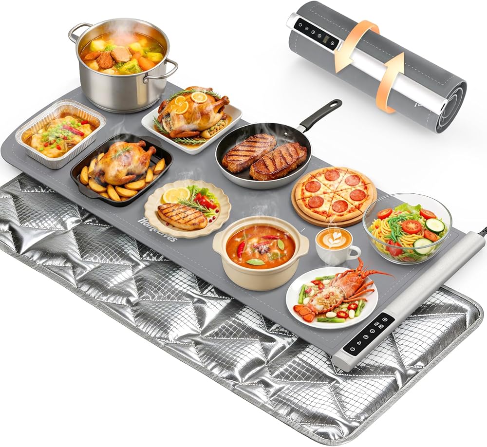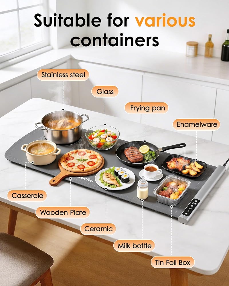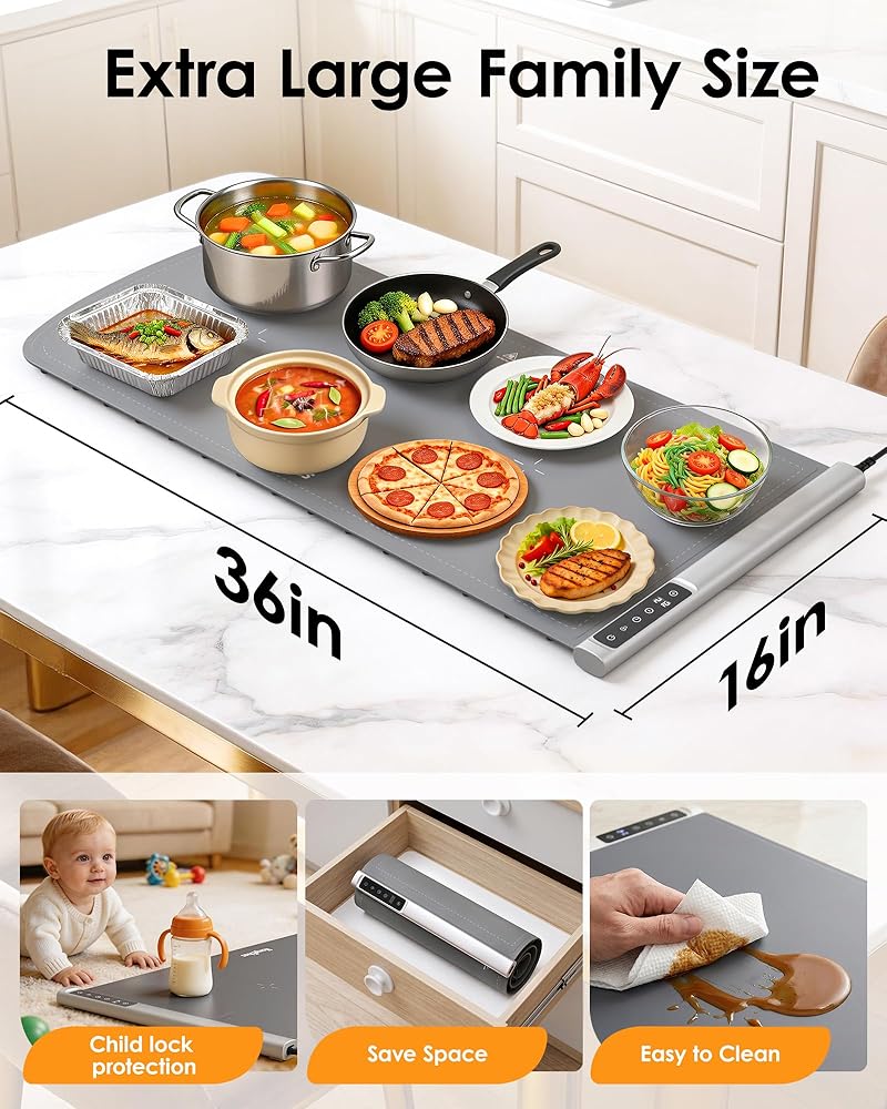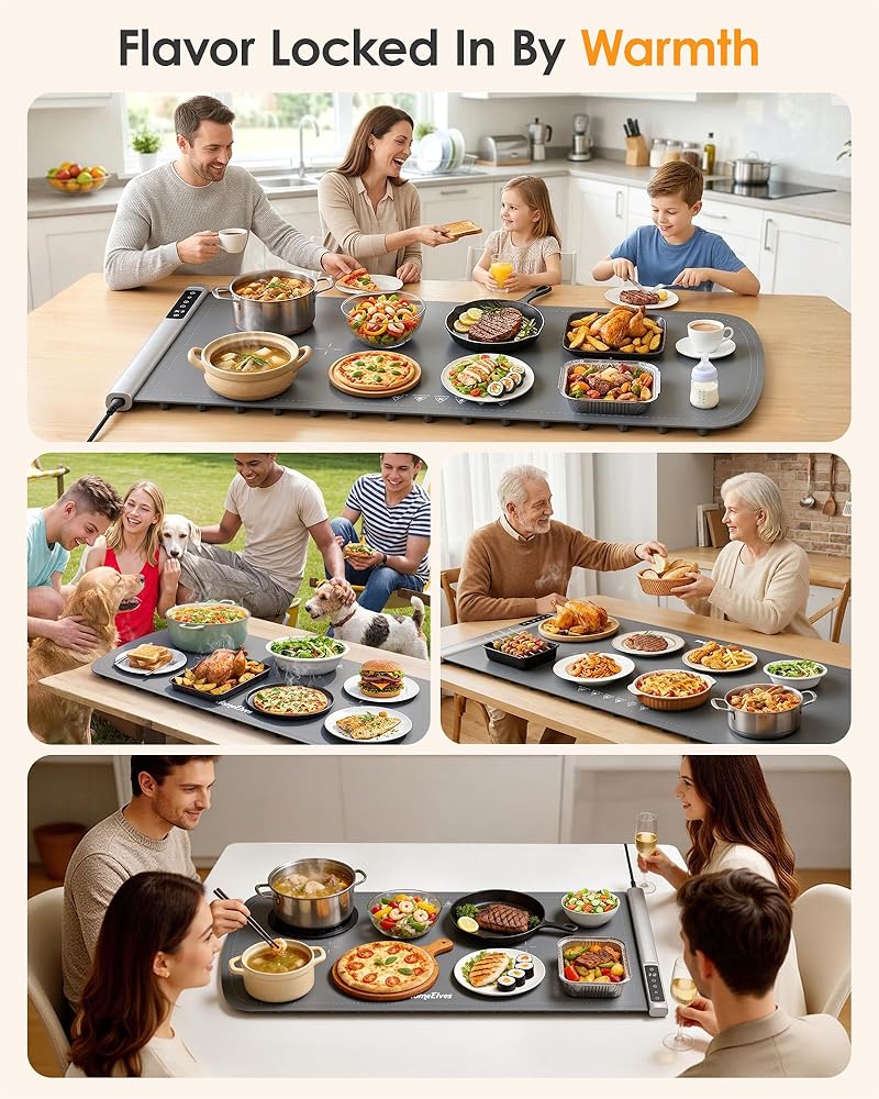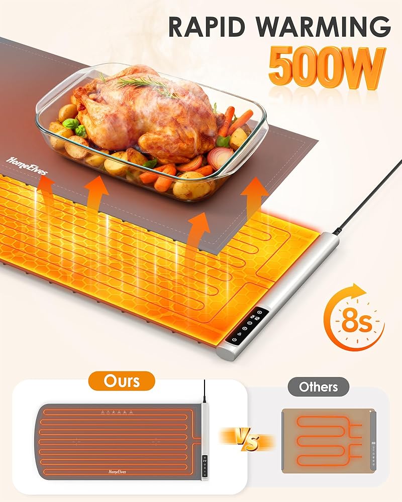 • 【Rapid Full-Surface Heating】This food warming mat features upgraded heating elements and optimized base coverage for instant heat transfer. The warming mat for food heats evenly and maintains a consistent temperature, while its 500W high power significantly reduces waiting time during gatherings.