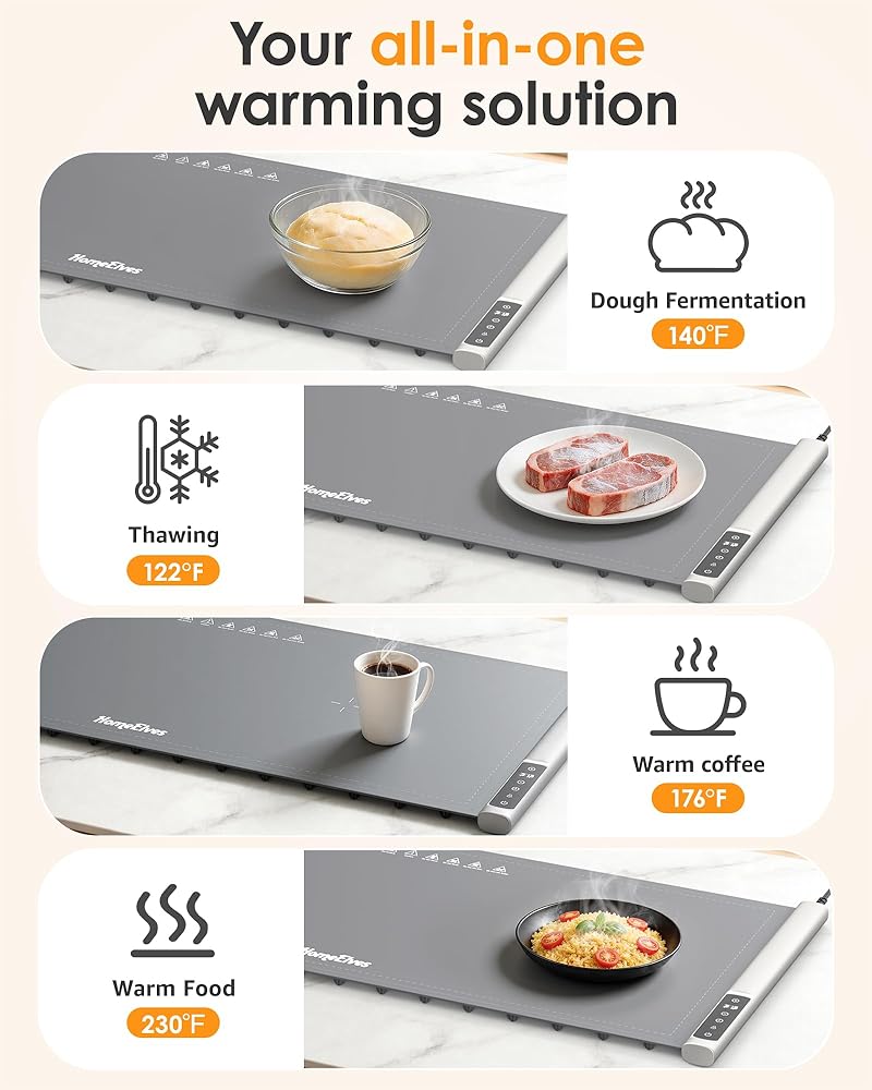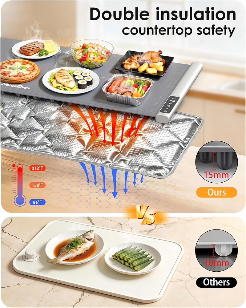 • 【Dual Countertop Protection】Includes an ultra-heat-resistant insulating mat that blocks heat, effectively protecting heat-sensitive surfaces like granite, marble, quartz, and glass from cracking or damage. Compared to traditional warming trays, this electric warming mat also features a raised base design to promote airflow and accelerate heat dissipation.