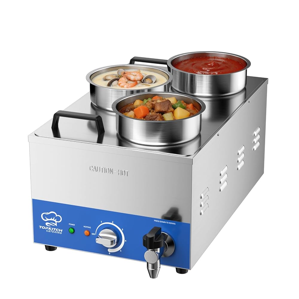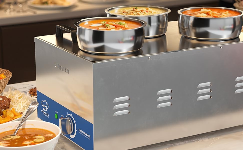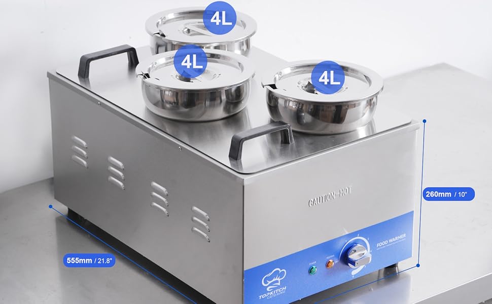 سعة ثلاثية 4 لتر: متعددة الاستخدامات وواسعة مجهزة بثلاثة دلاء حساء سعة 4 لتر، يوفر هذا السخان مساحة واسعة لاستيعاب مجموعة متنوعة من الحساء أو اليخنات أو المرق أو الأطباق الجانبية - كل ذلك في نفس الوقت. لا مزيد من خلط الروائح أو التضحية بالتنوع - يمكنك تقديم ثلاثة أطعمة متميزة بثقة.