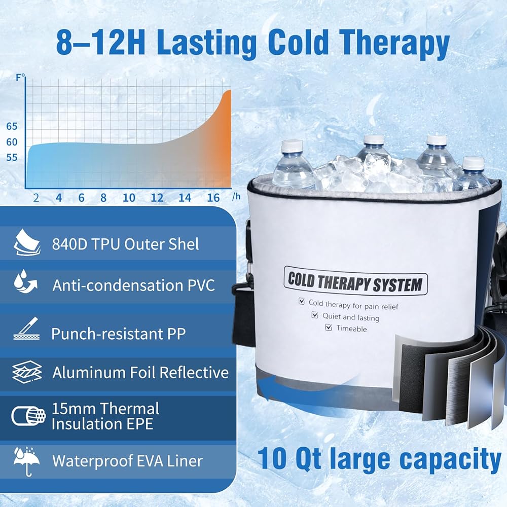 【All-Day Peace of Mind】Frequently changing ice water and ice packs during recovery can be a pain. Our leading six-layer insulation and 10Qt large-capacity bucket ensure a long, stable, low-temperature cycle of 8–12 hours. Just fill it once with ice or frozen bottles and use it multiple times. Truly "make recovery more worry-free!"